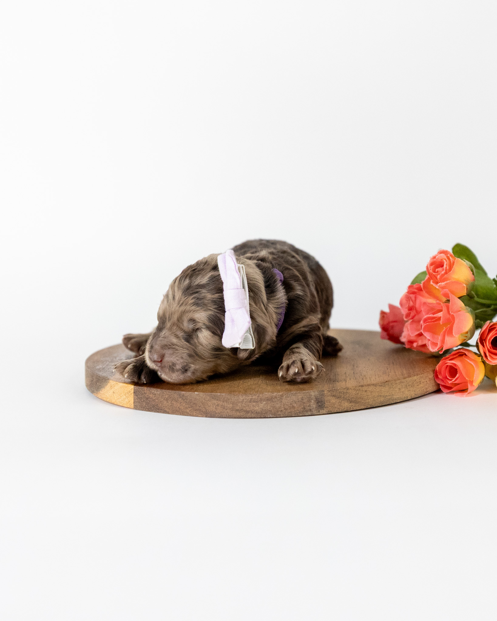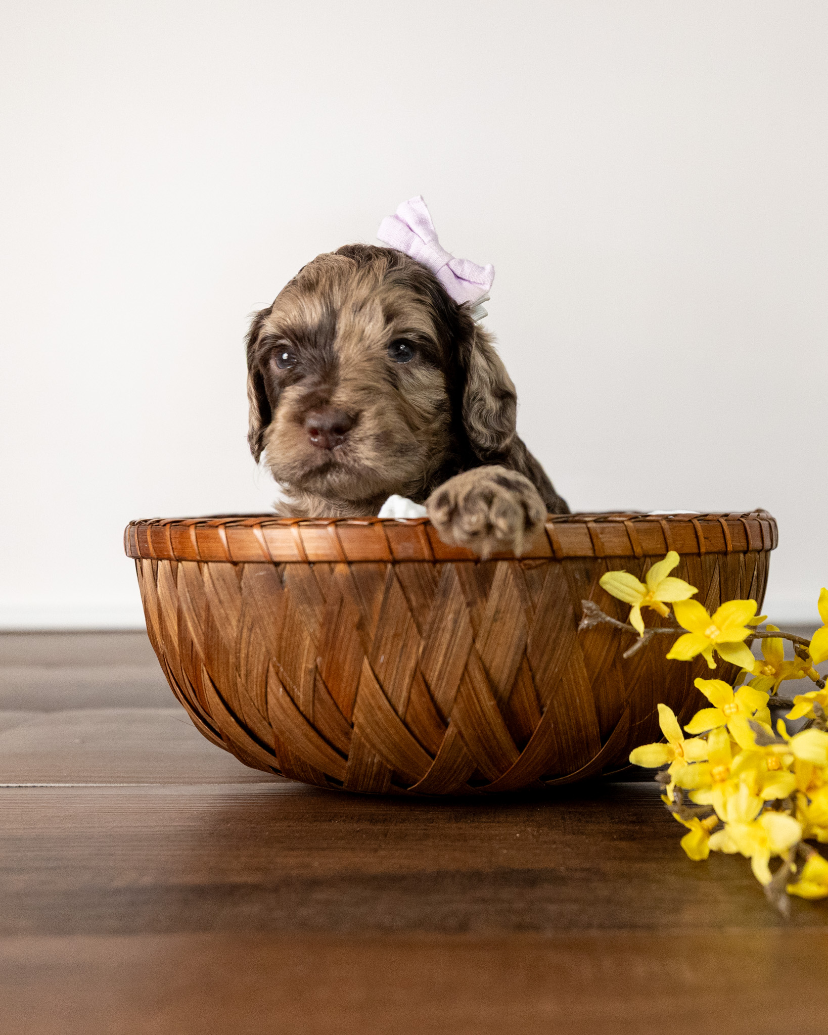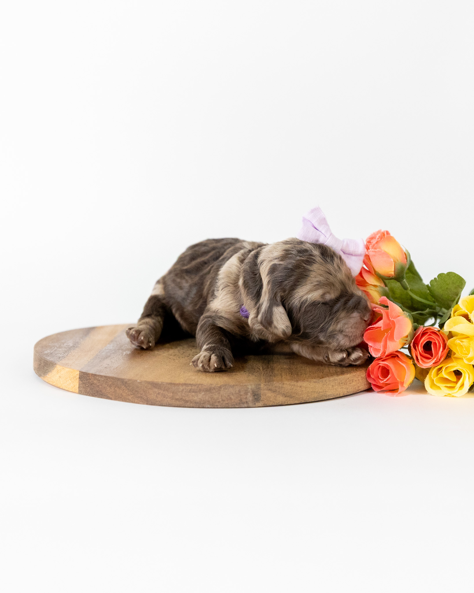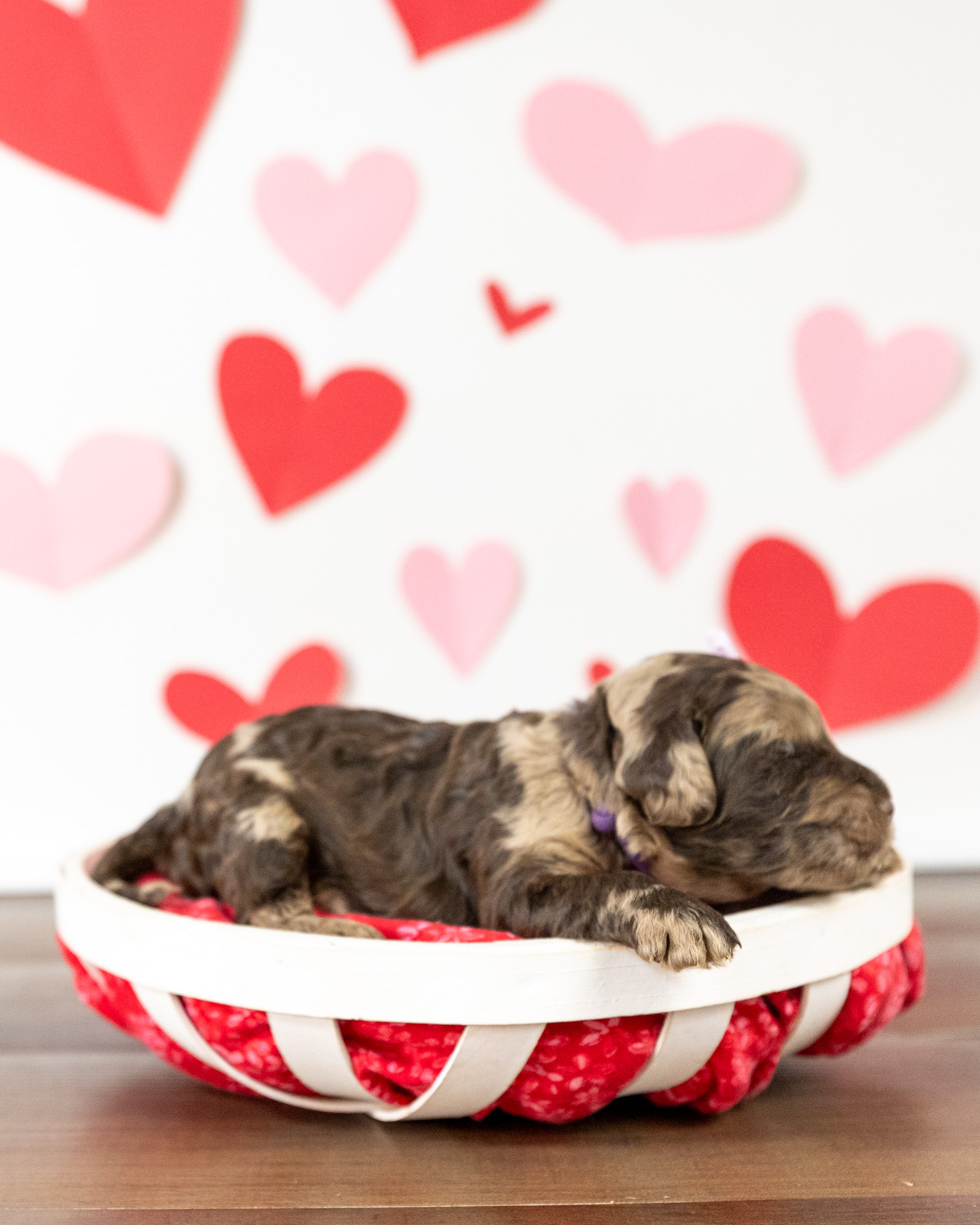 Violet is a medium multigen Labradoodle puppy who will be ready for her forever home March 17th! Her soft, fluffy coat is hypoallergenic and non-shedding, ensuring endless snuggles without fear of allergic reactions.