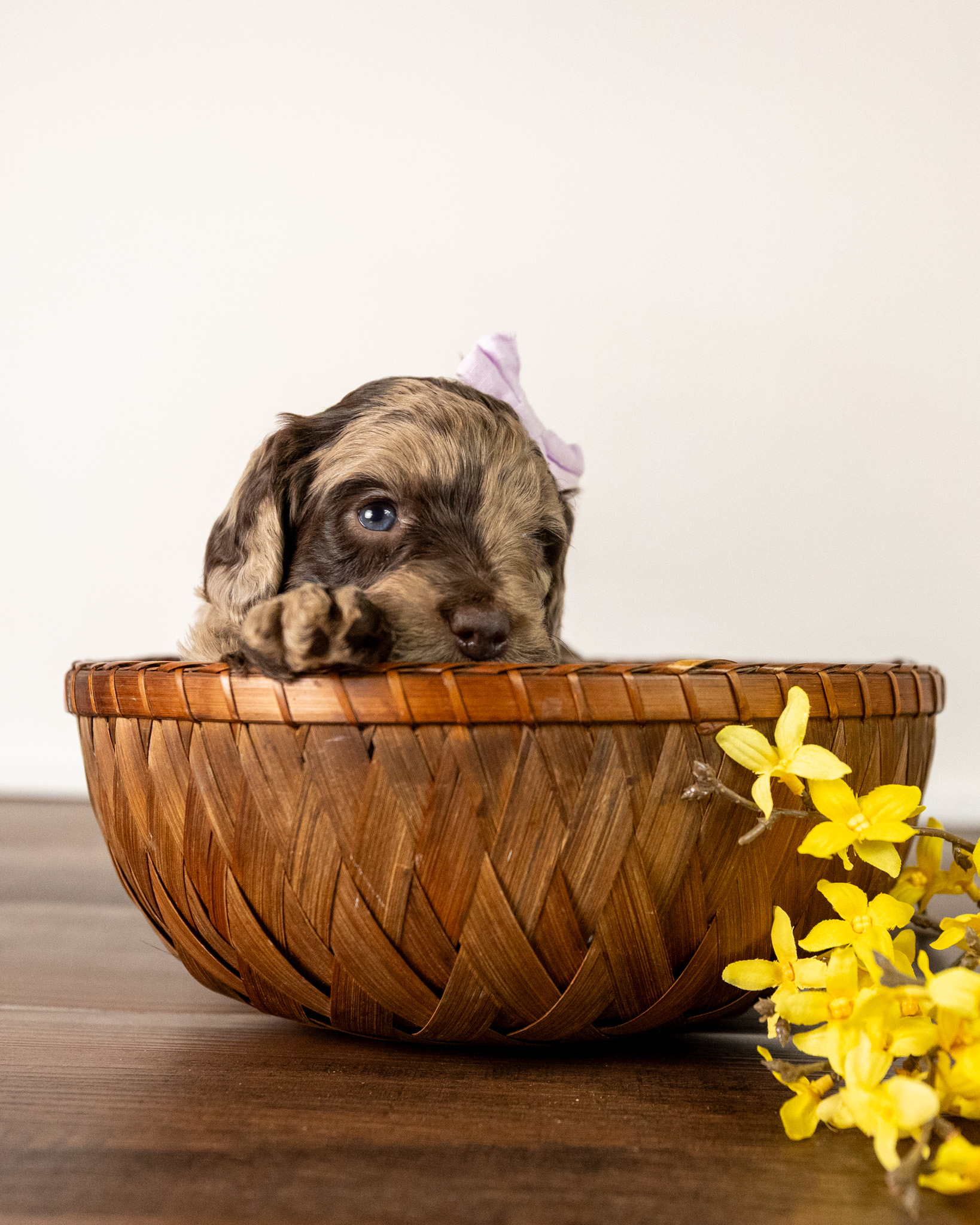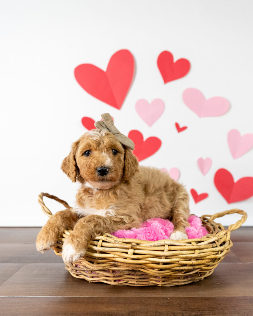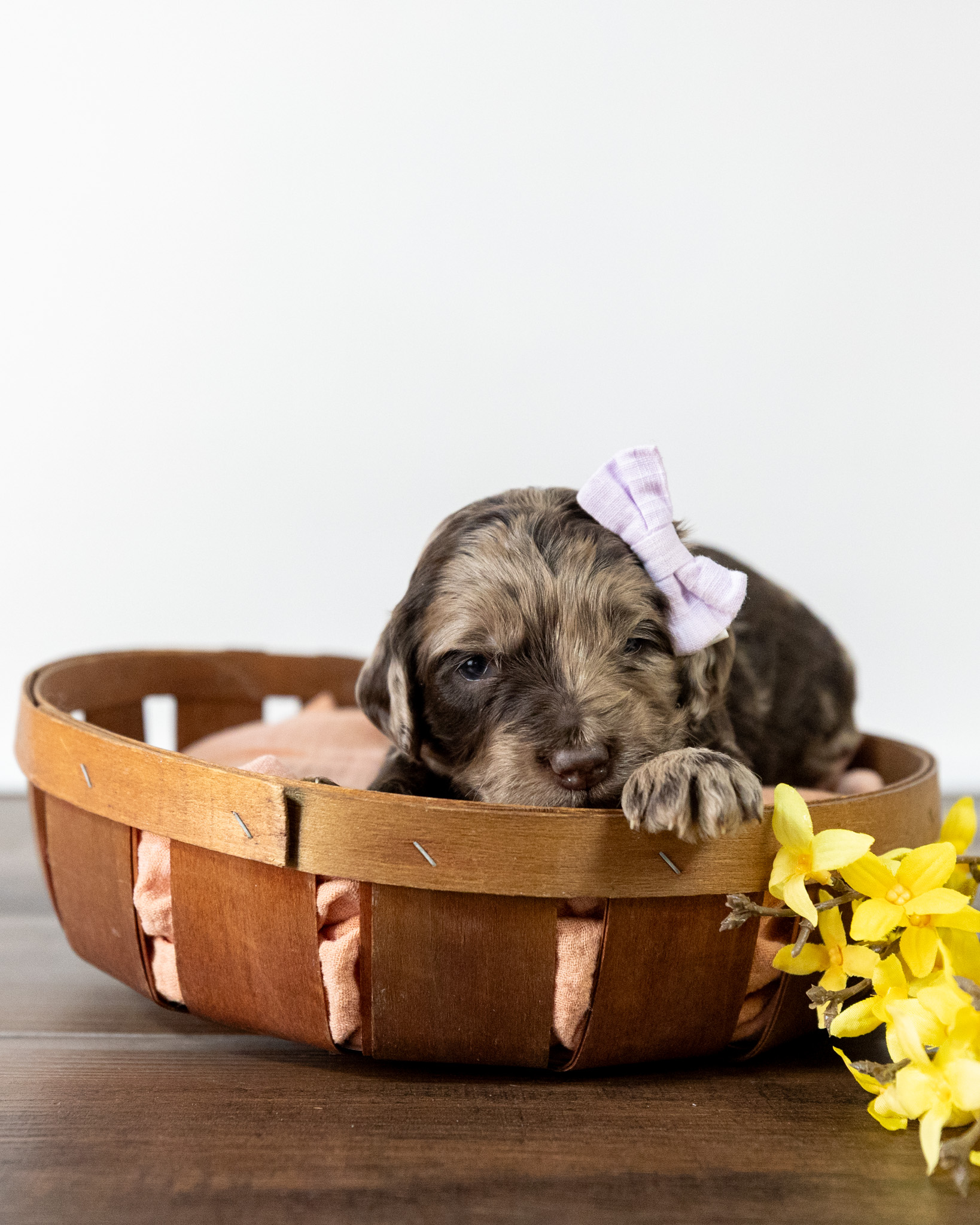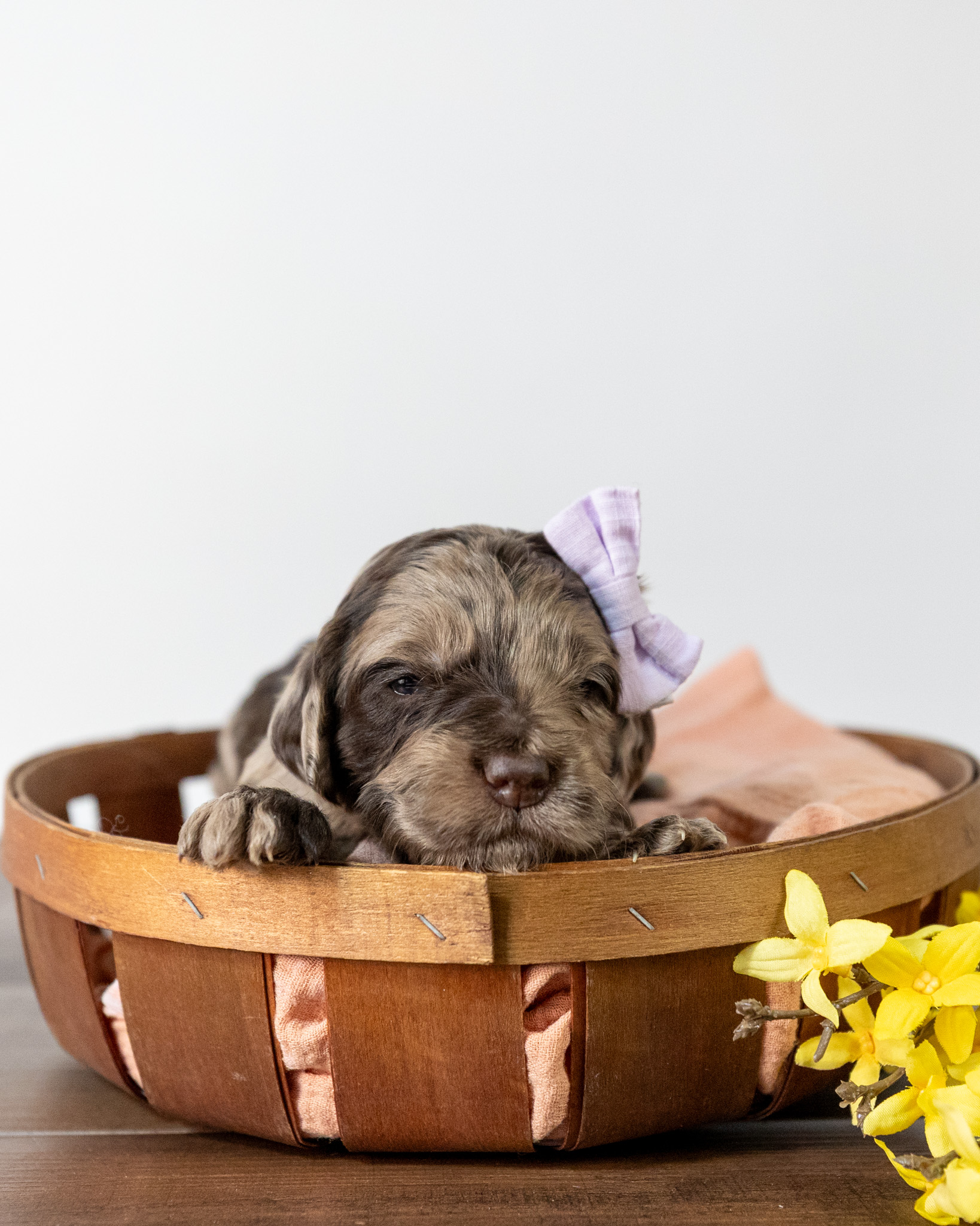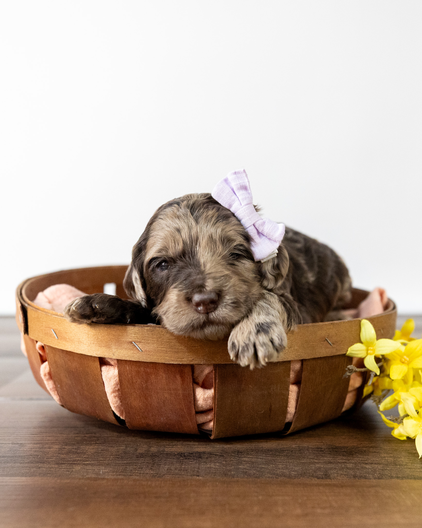 Violet is a medium multigen Labradoodle puppy who will be ready for her forever home March 17th! Her soft, fluffy coat is hypoallergenic and non-shedding, ensuring endless snuggles without fear of allergic reactions.