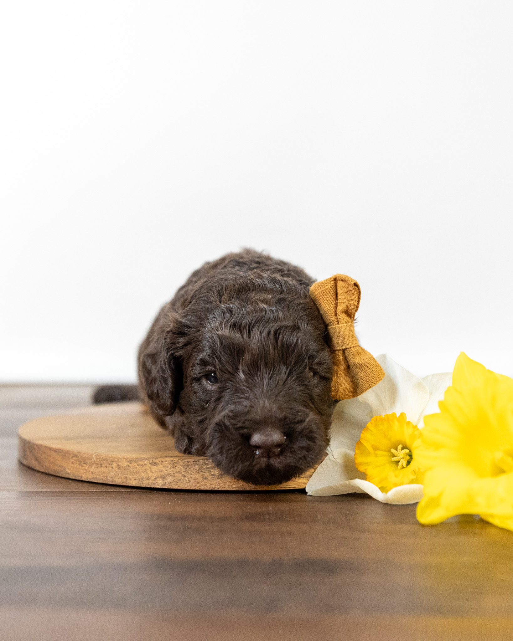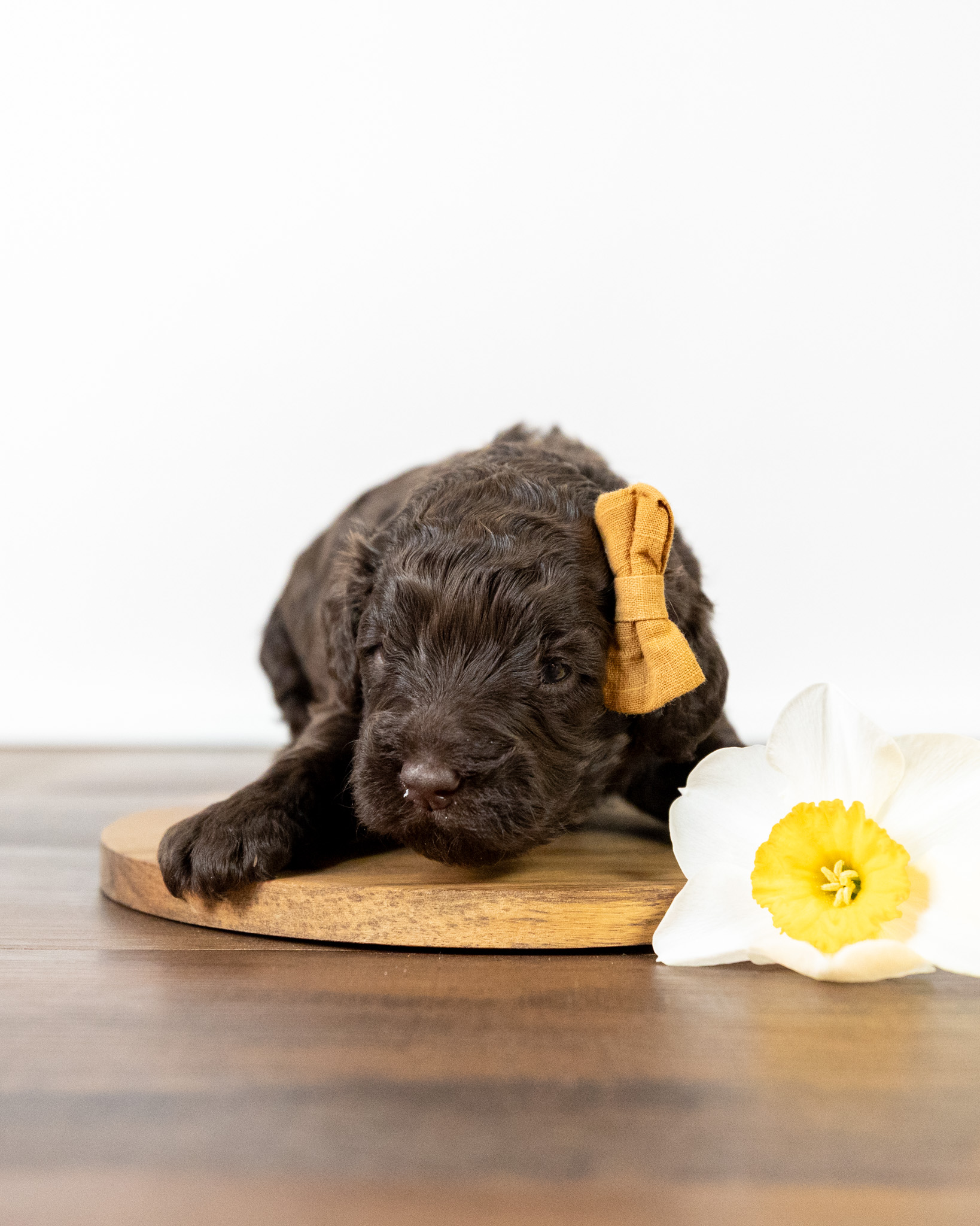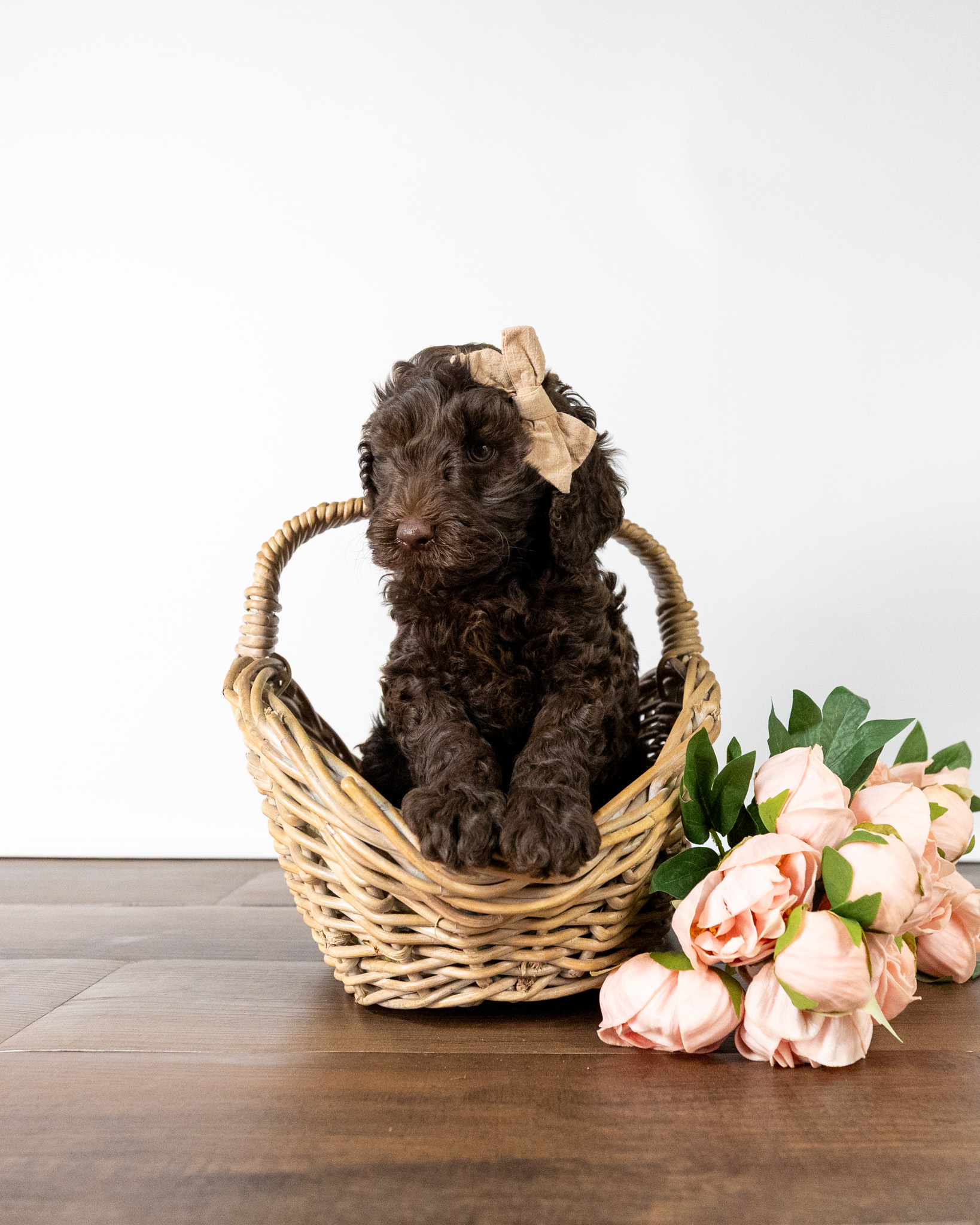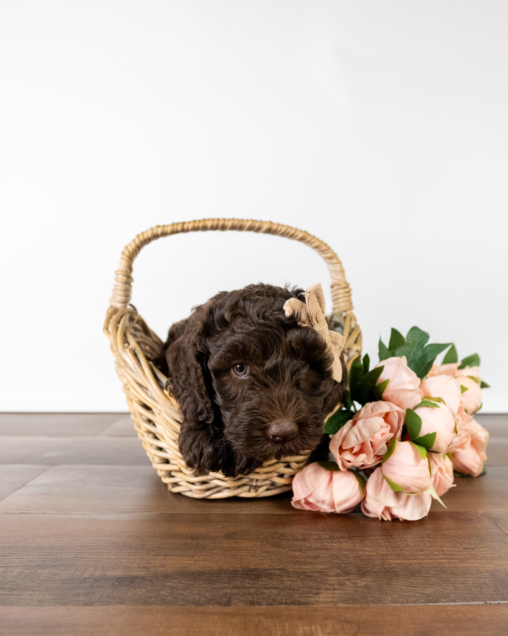 Cocoa is a medium multigen Labradoodle puppy with a beautiful chocolate coat.