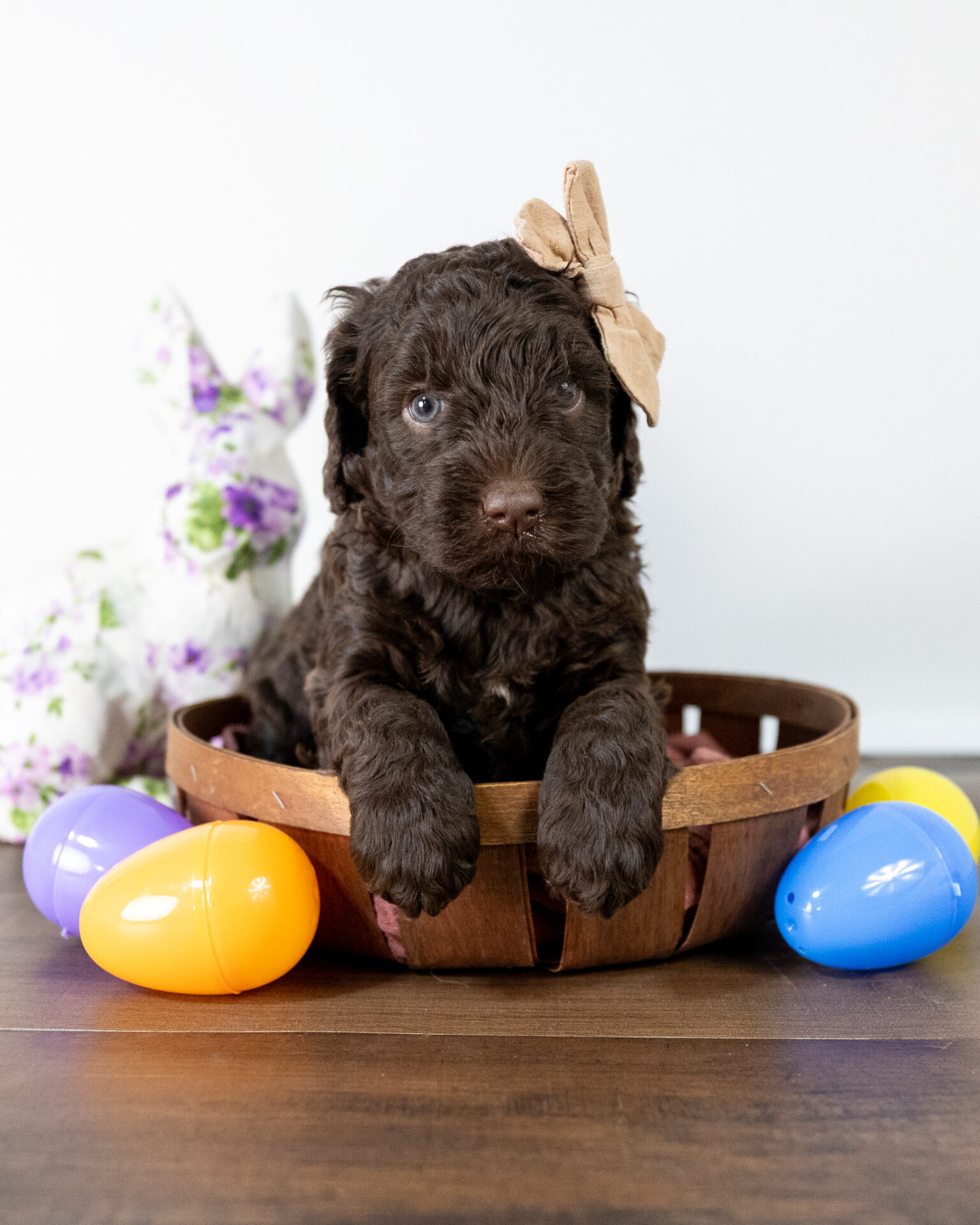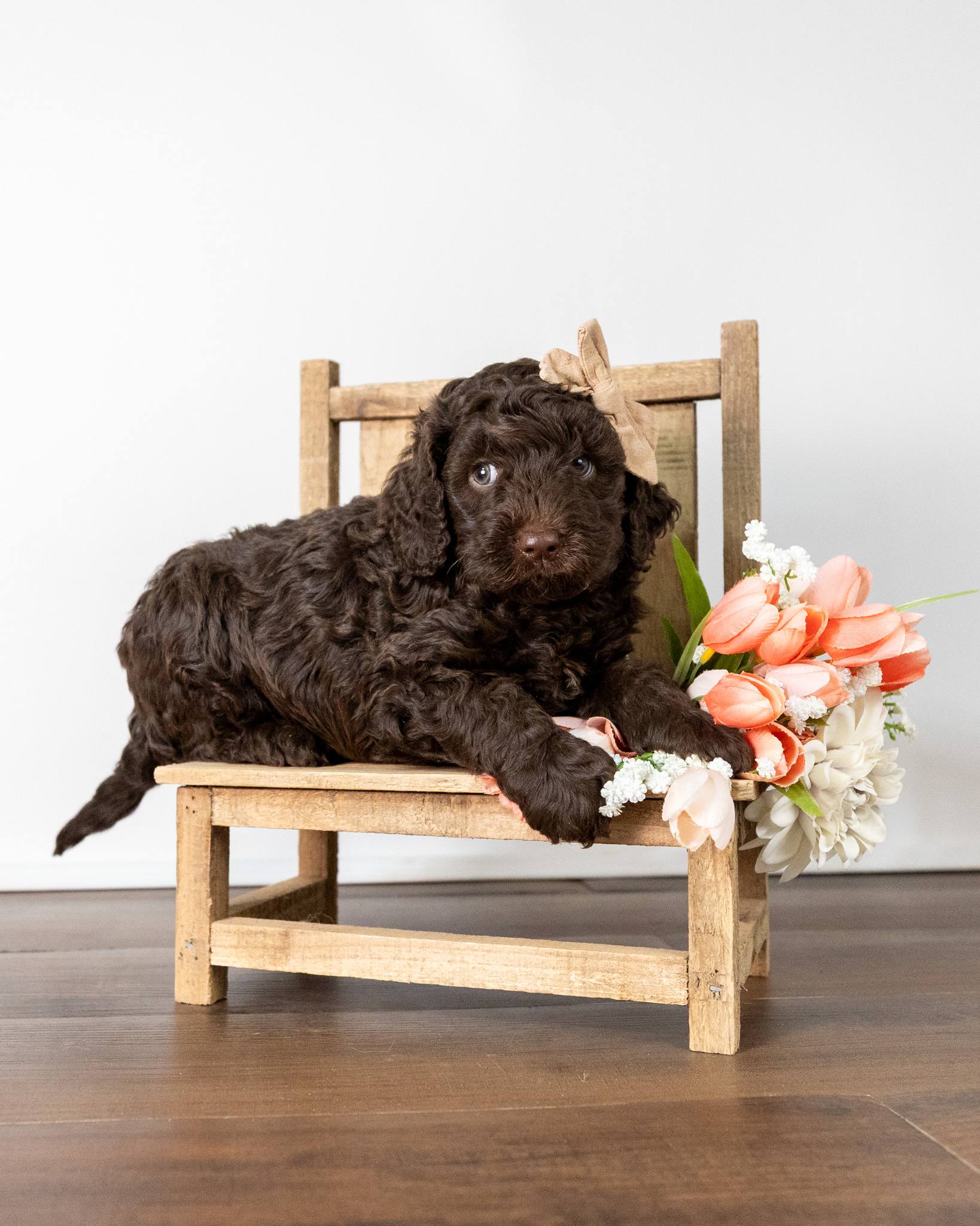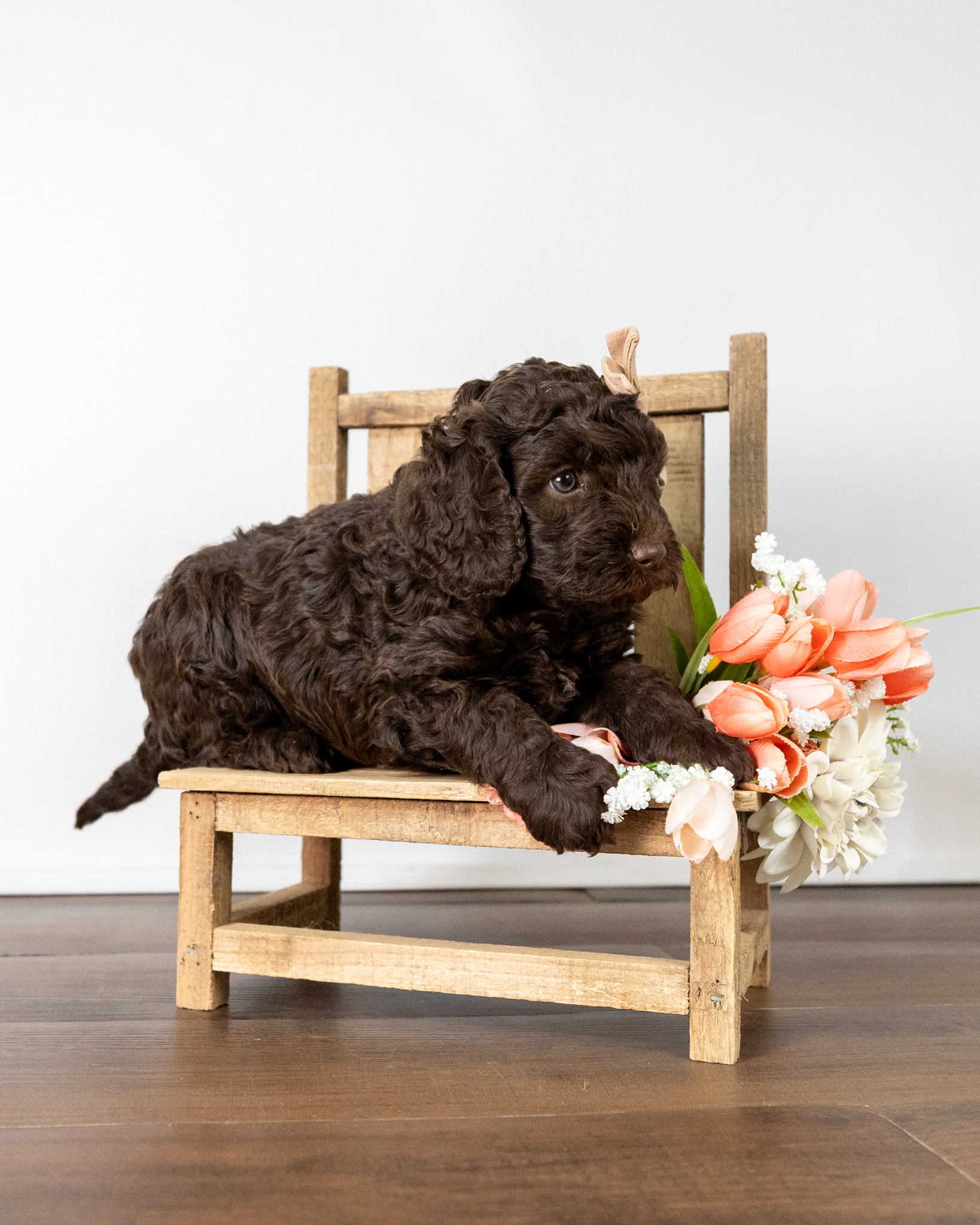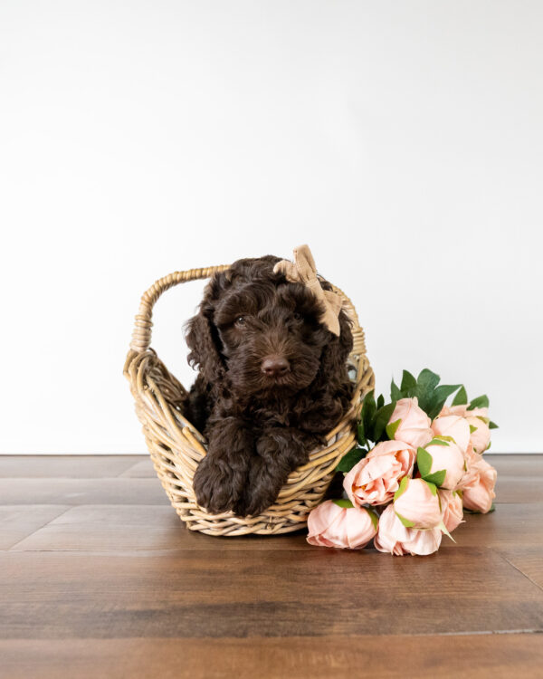 Cocoa is a medium multigen Labradoodle puppy with a beautiful chocolate coat.