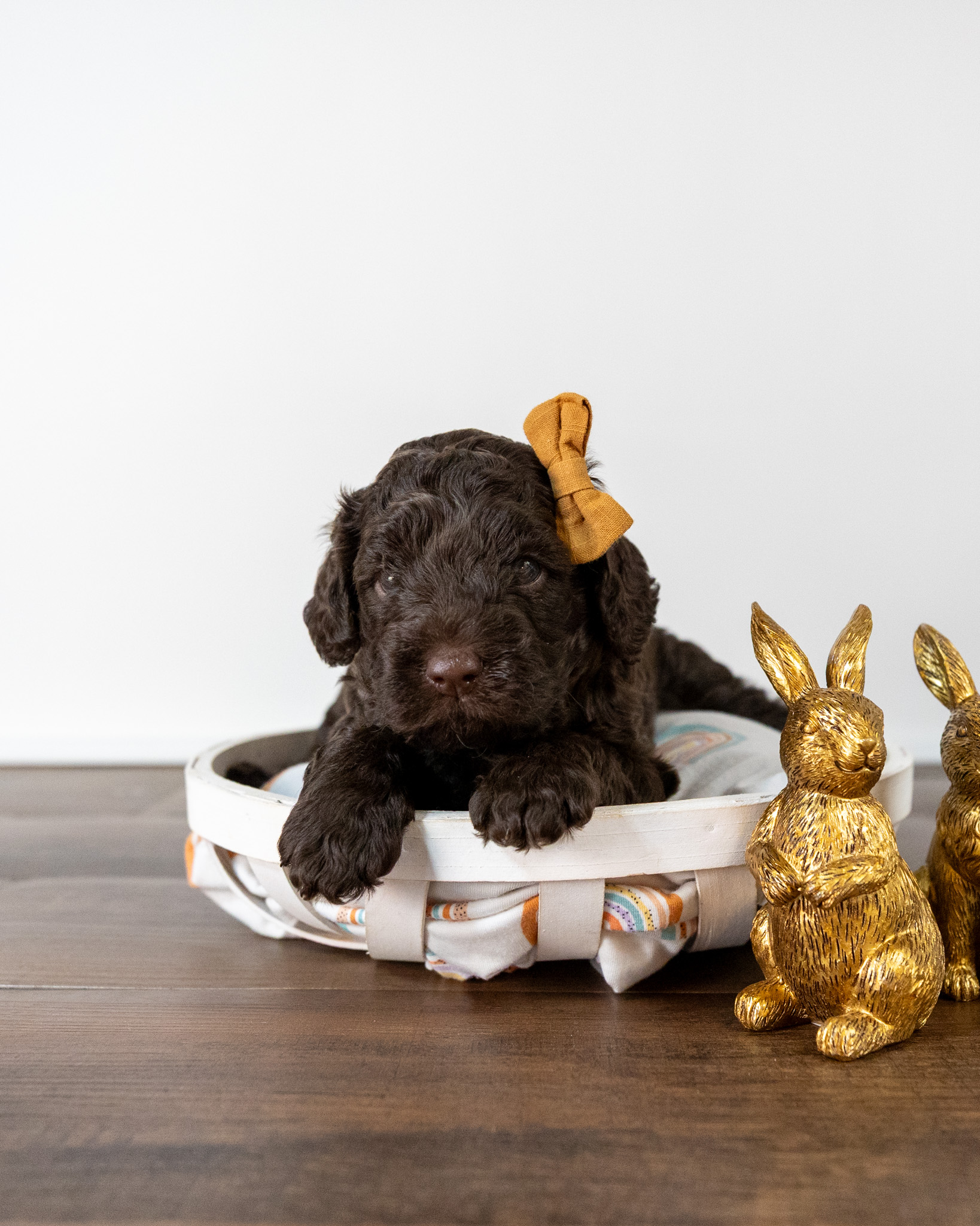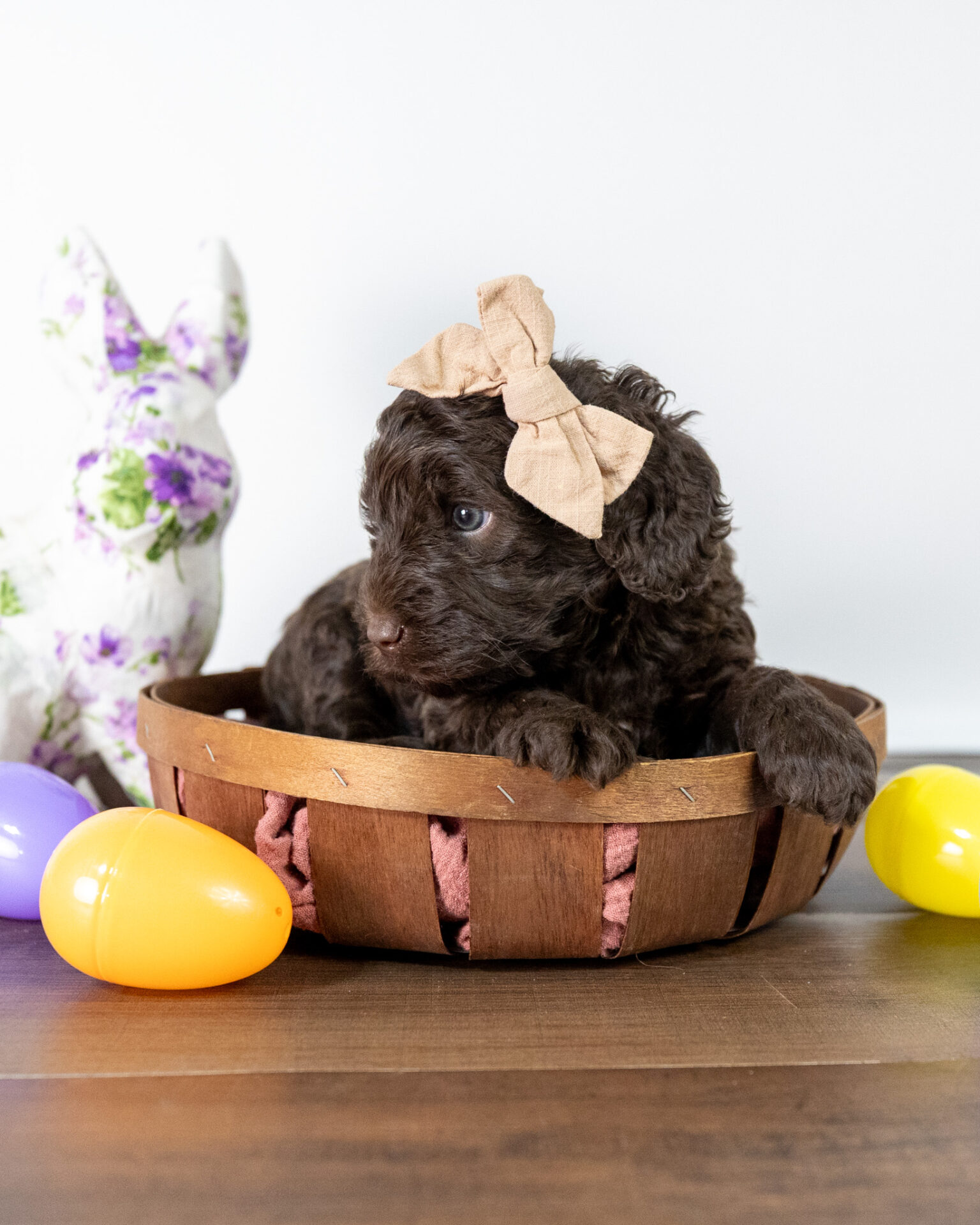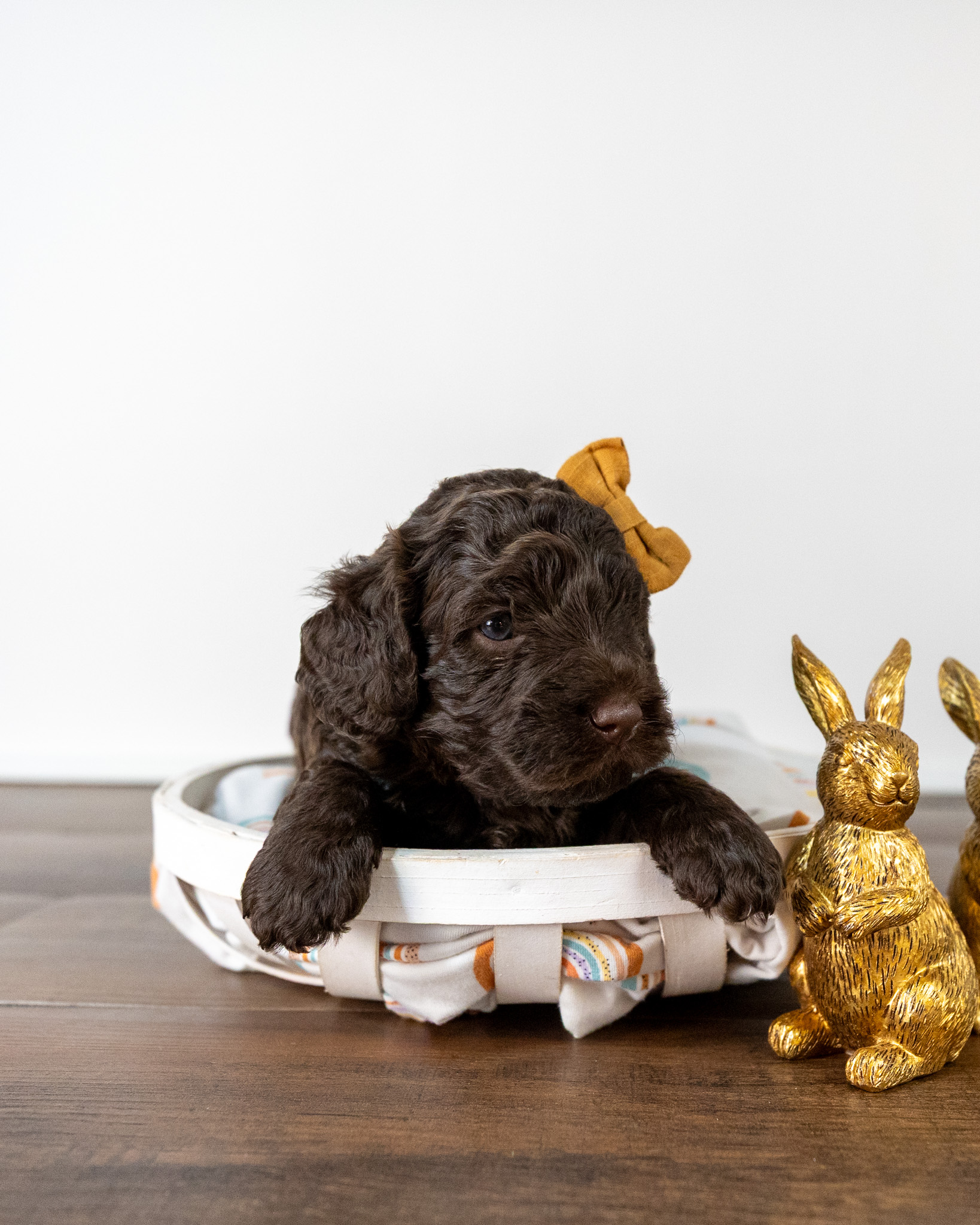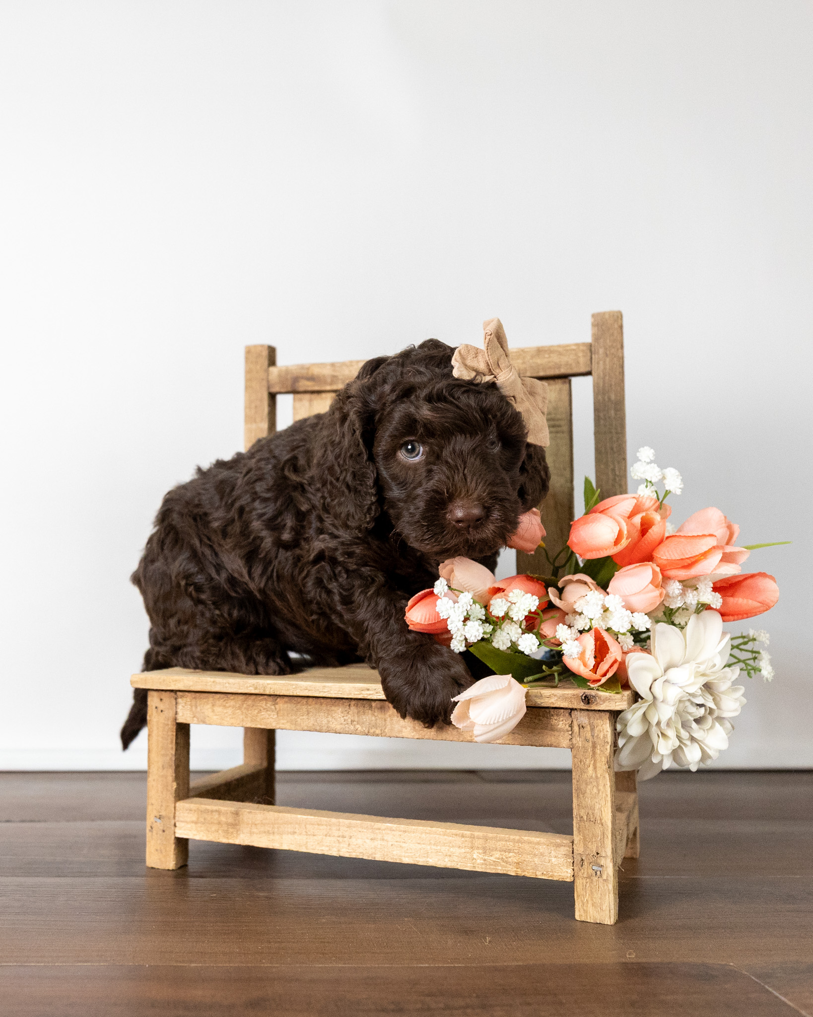 Cocoa is a medium multigen Labradoodle puppy with a beautiful chocolate coat.