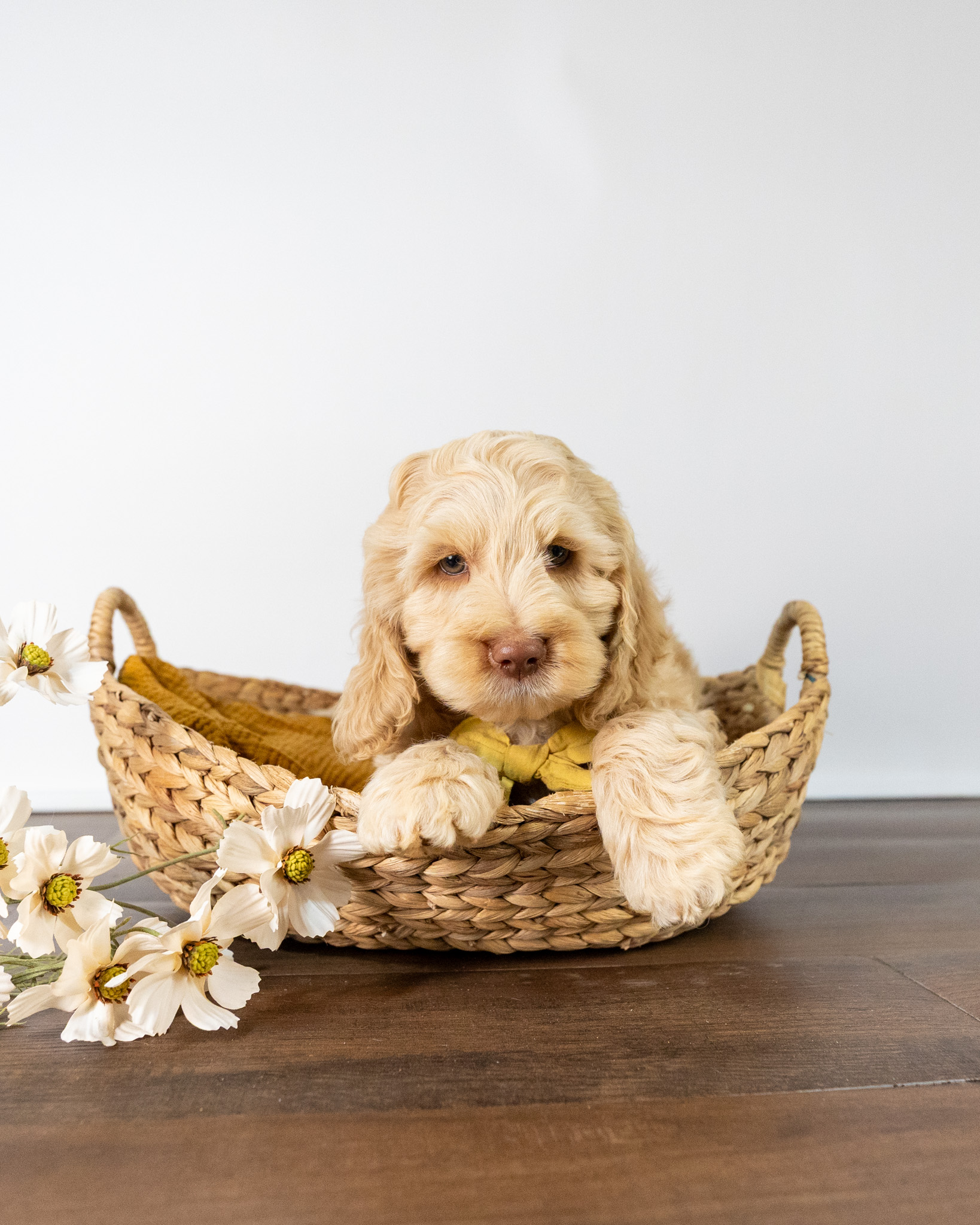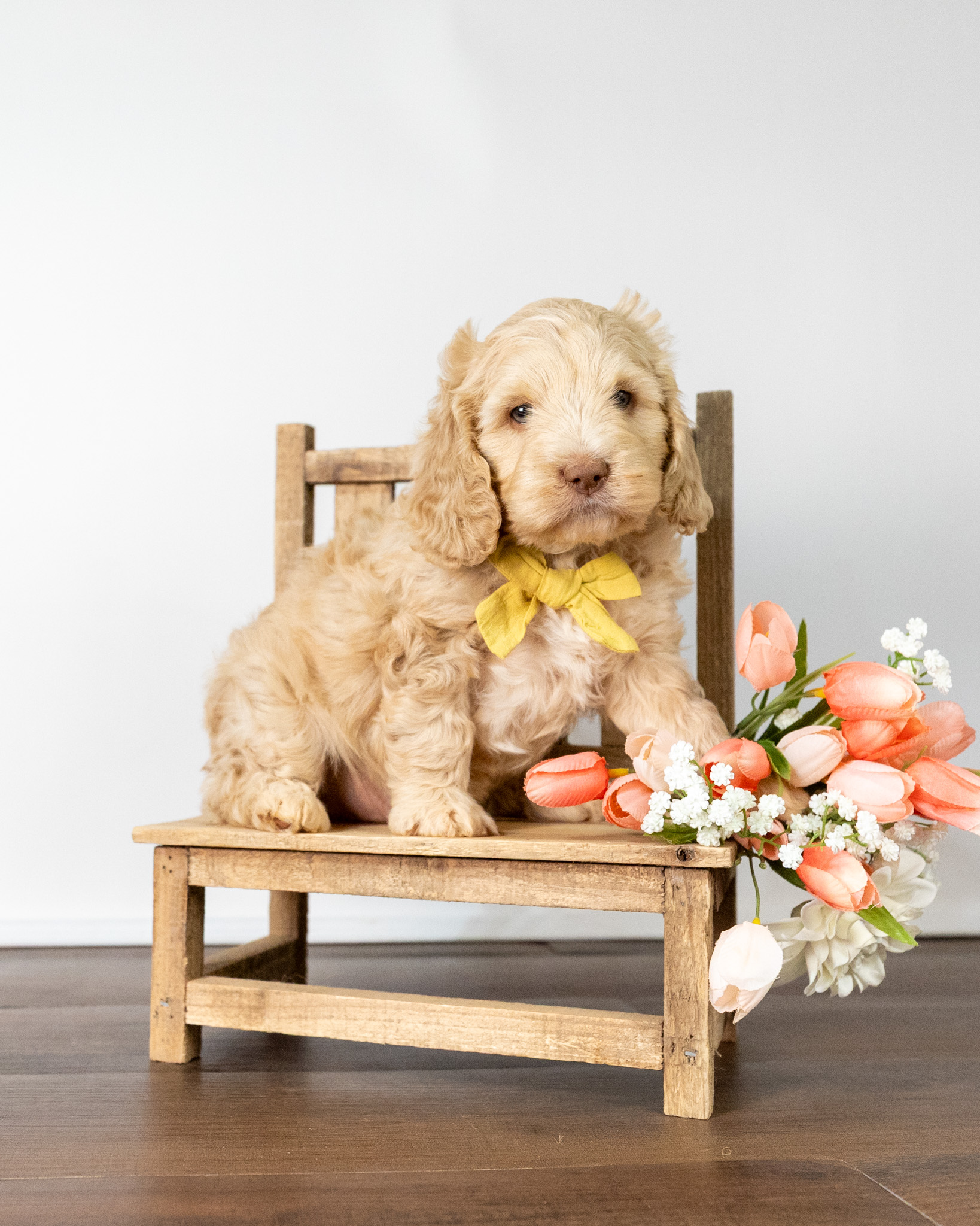 Caramel is a red male multigen standard Goldendoodle puppy who will be ready to go home May 26th!