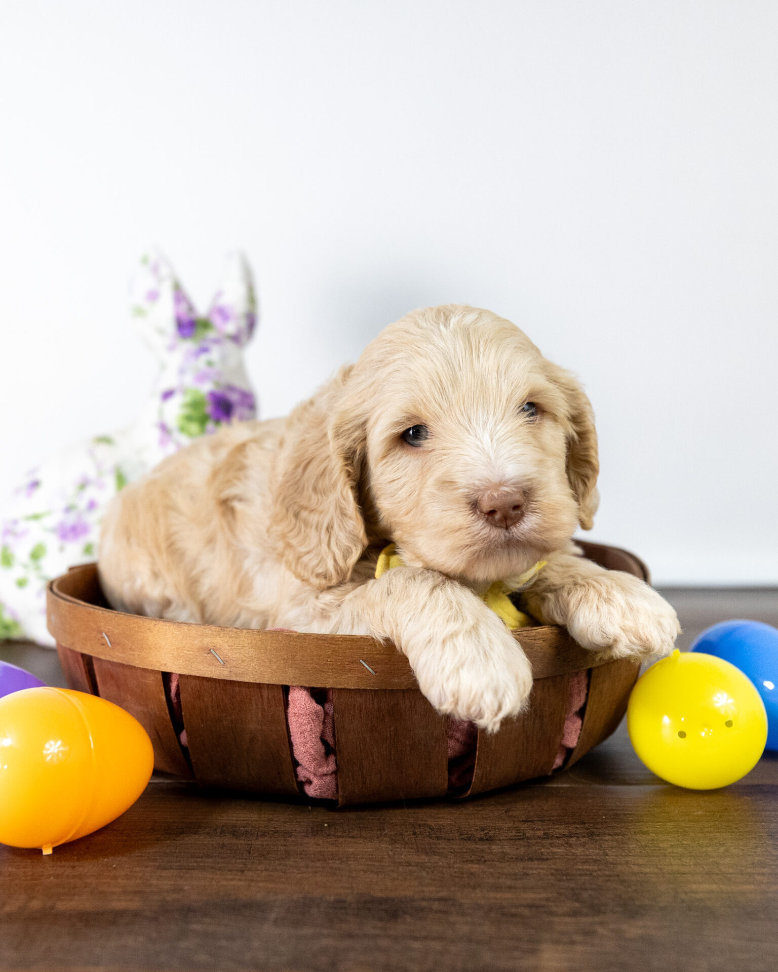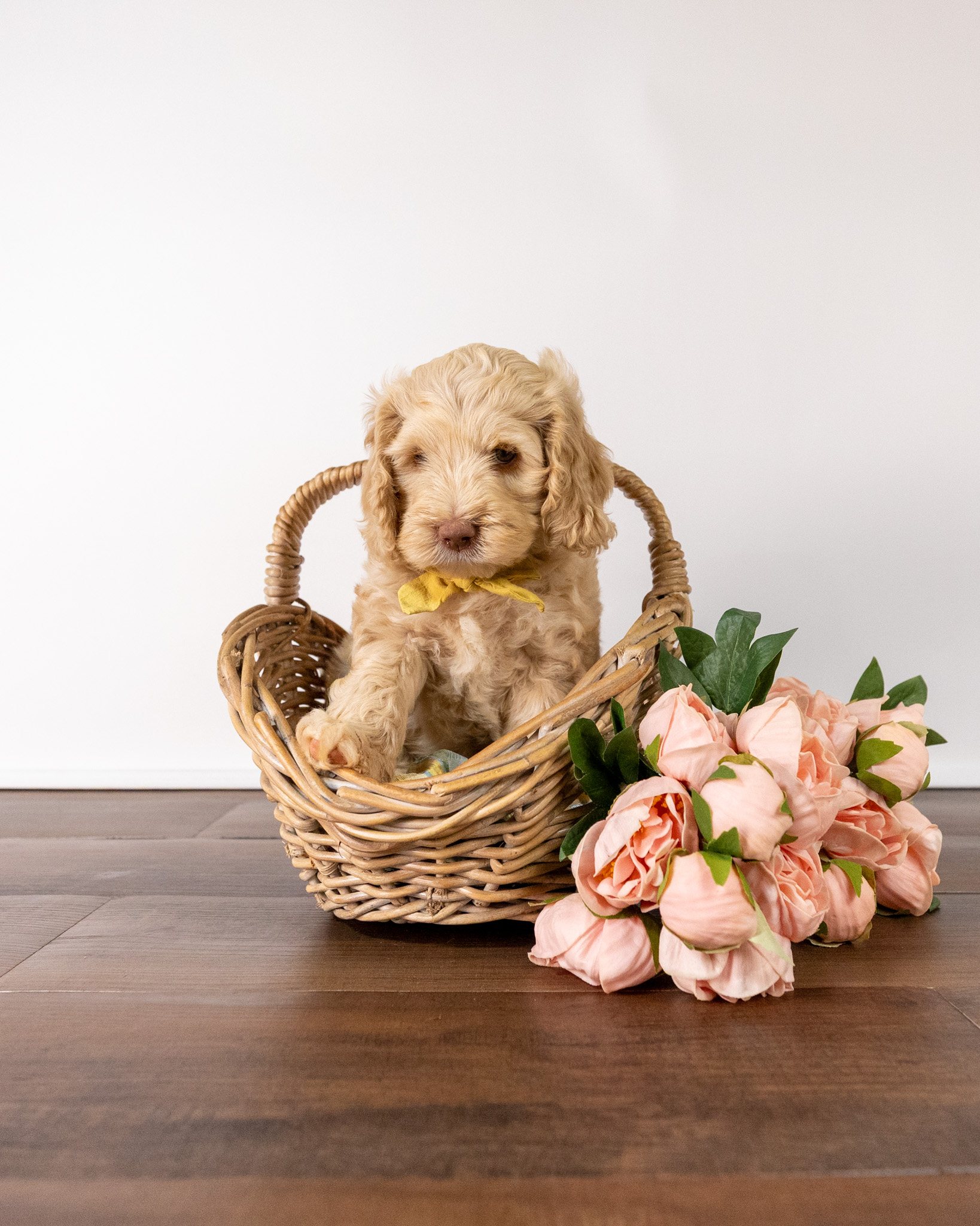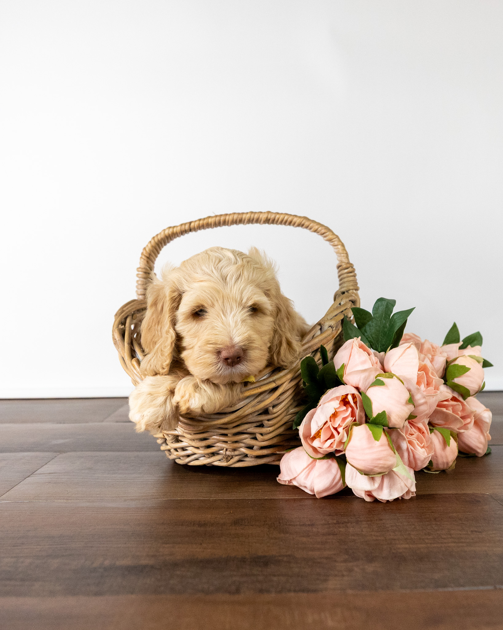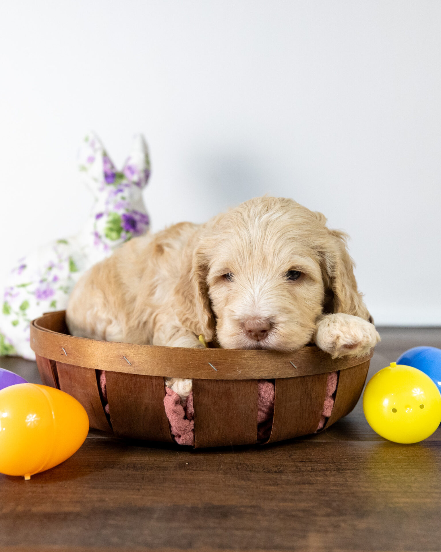 Milkshake is a light gold parti male multigen standard Goldendoodle puppy who will be ready to go home May 26th!