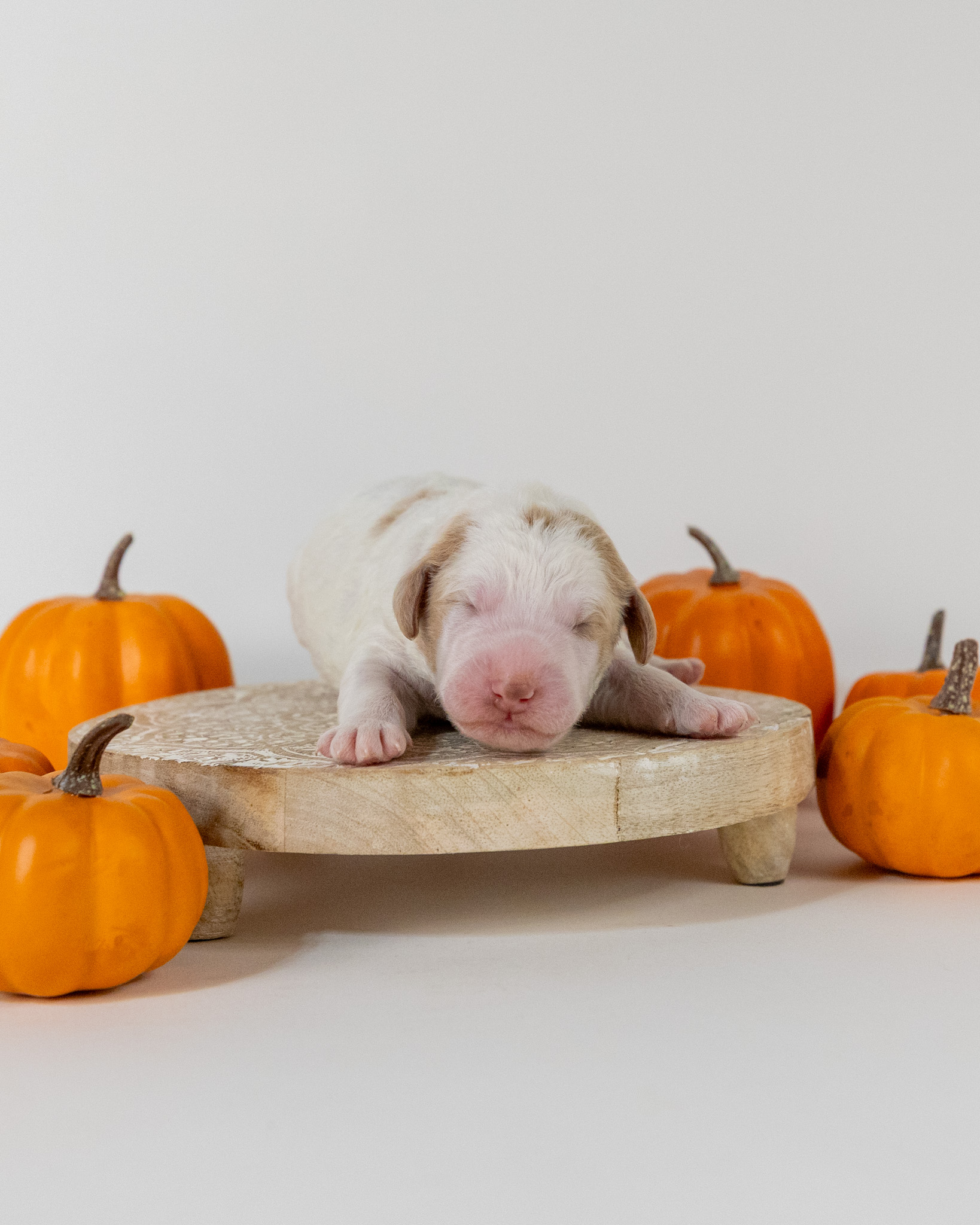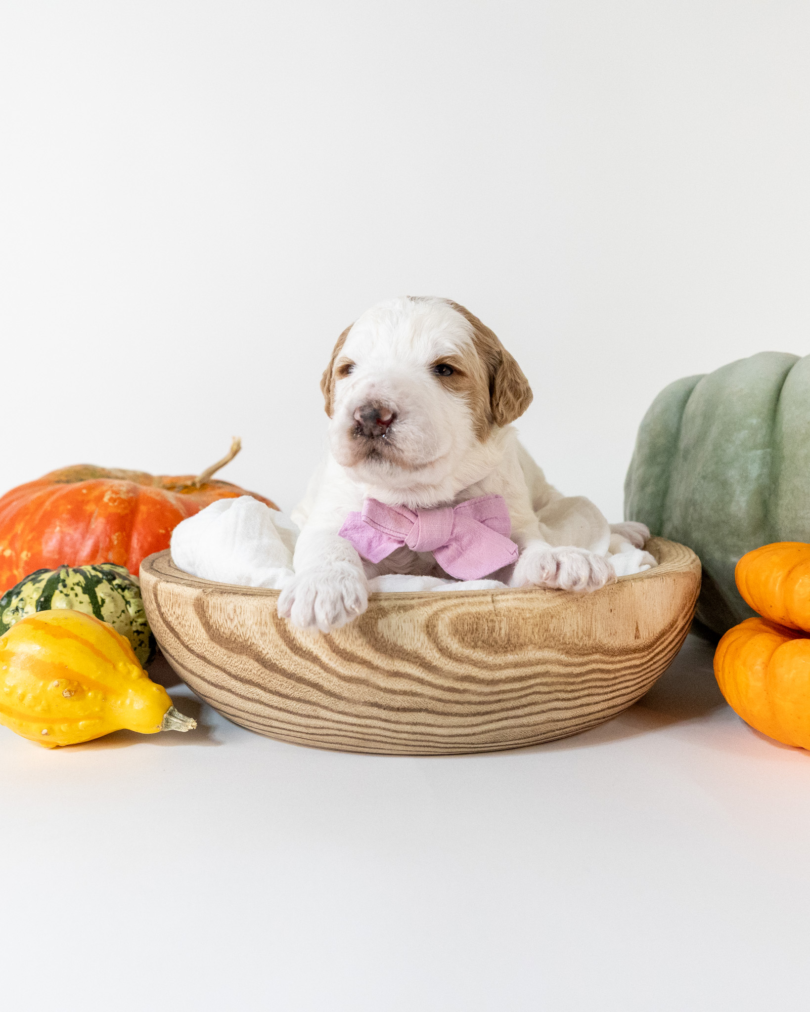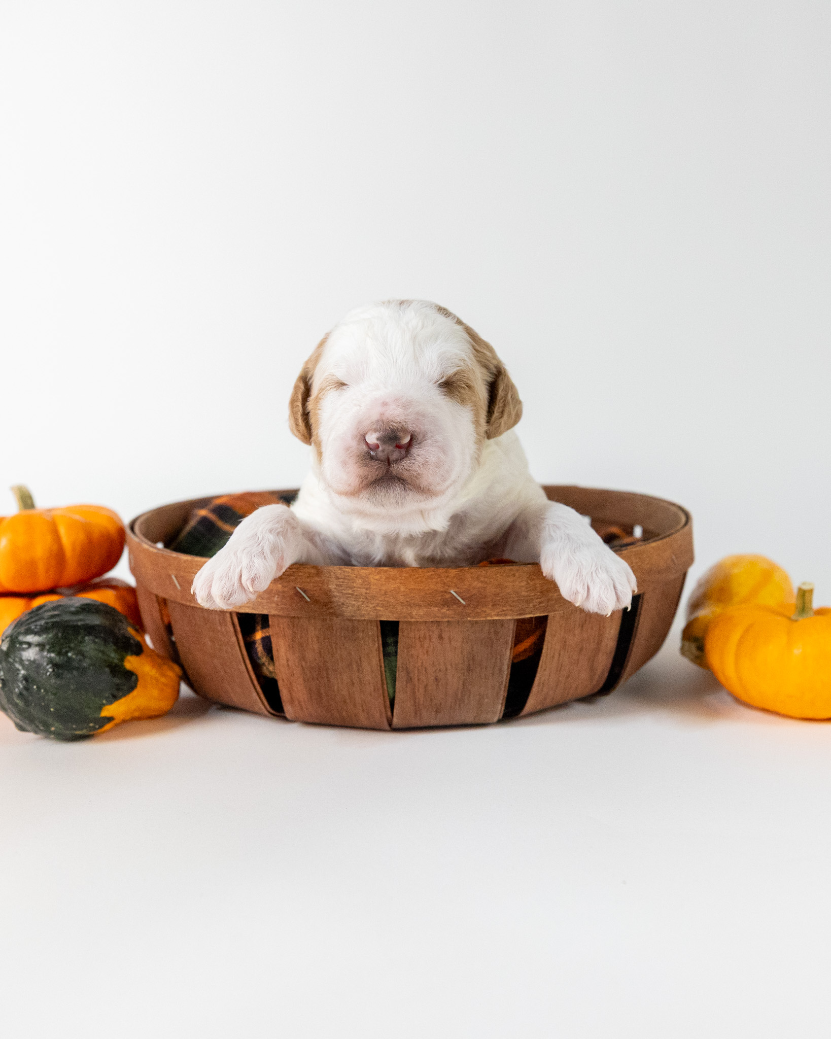 Valentine is a golden parti standard Goldendoodle puppy who will be ready for her forever home around December 9th.