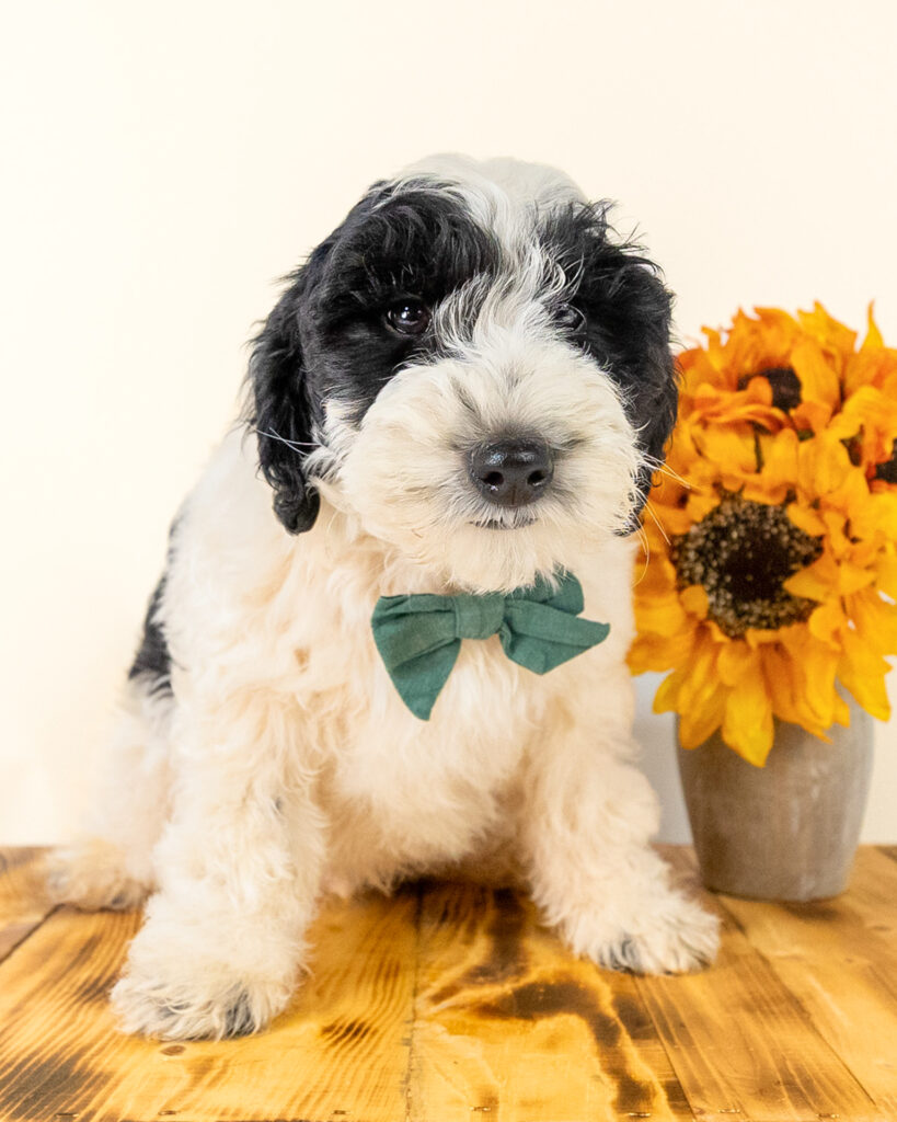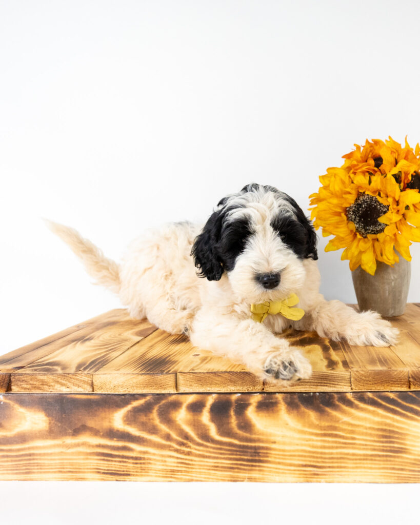 Granite is a black and white parti Goldendoodle puppy who will be ready for his forever home around October 14th.