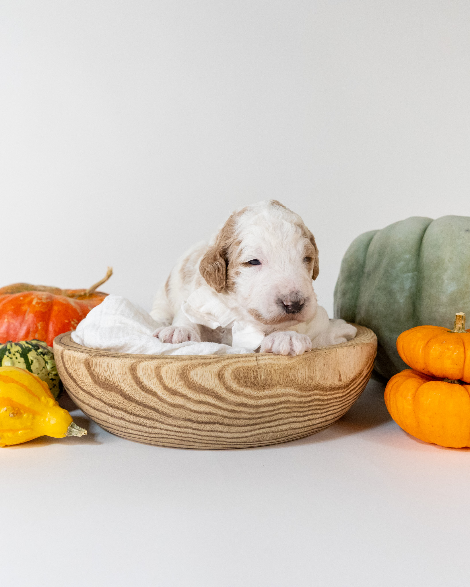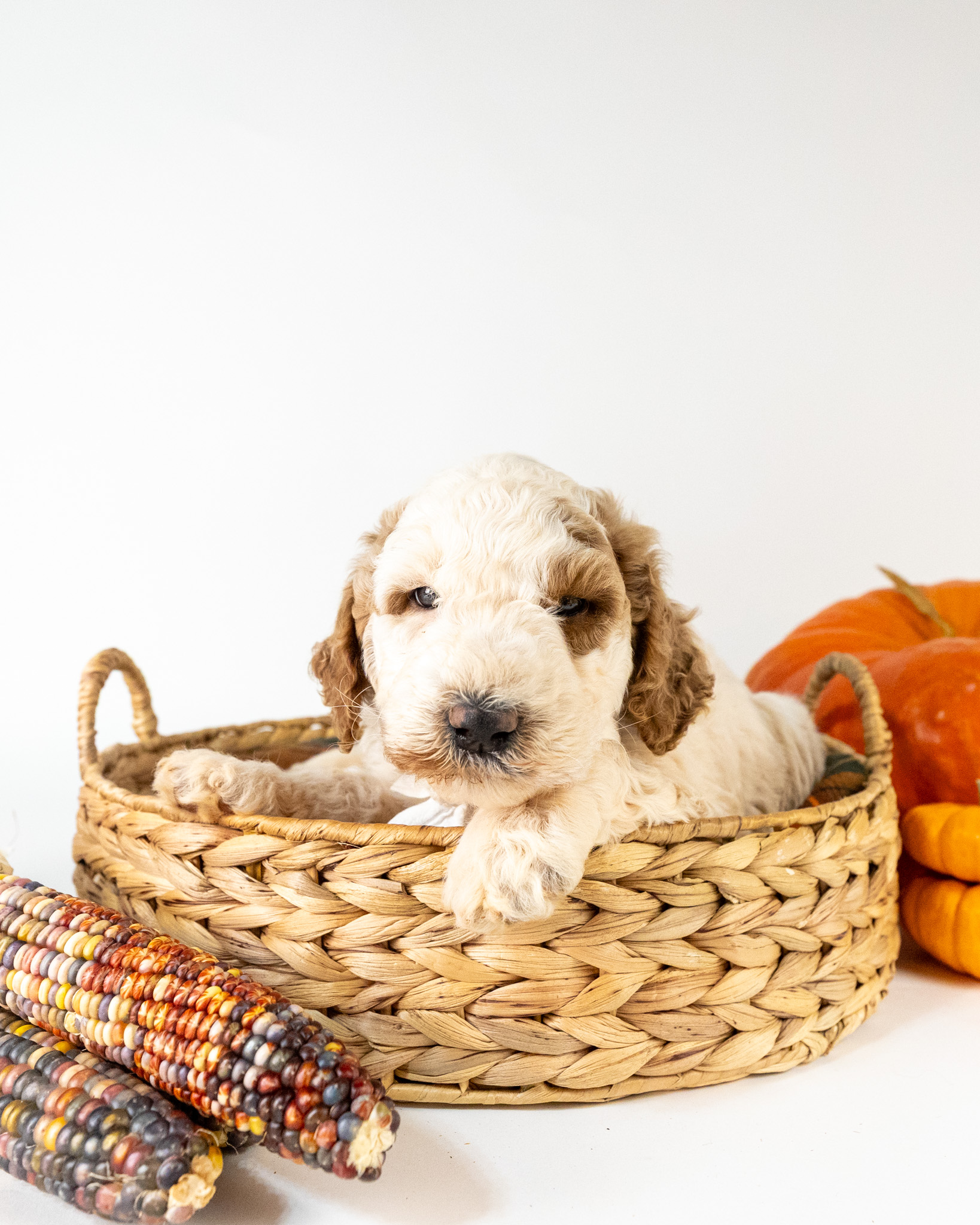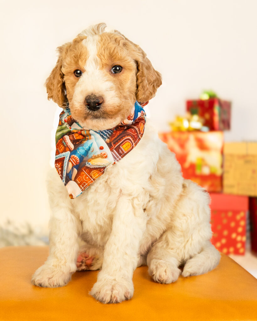 Franz is a golden parti standard Goldendoodle puppy who will be ready for his forever home around December 9th.