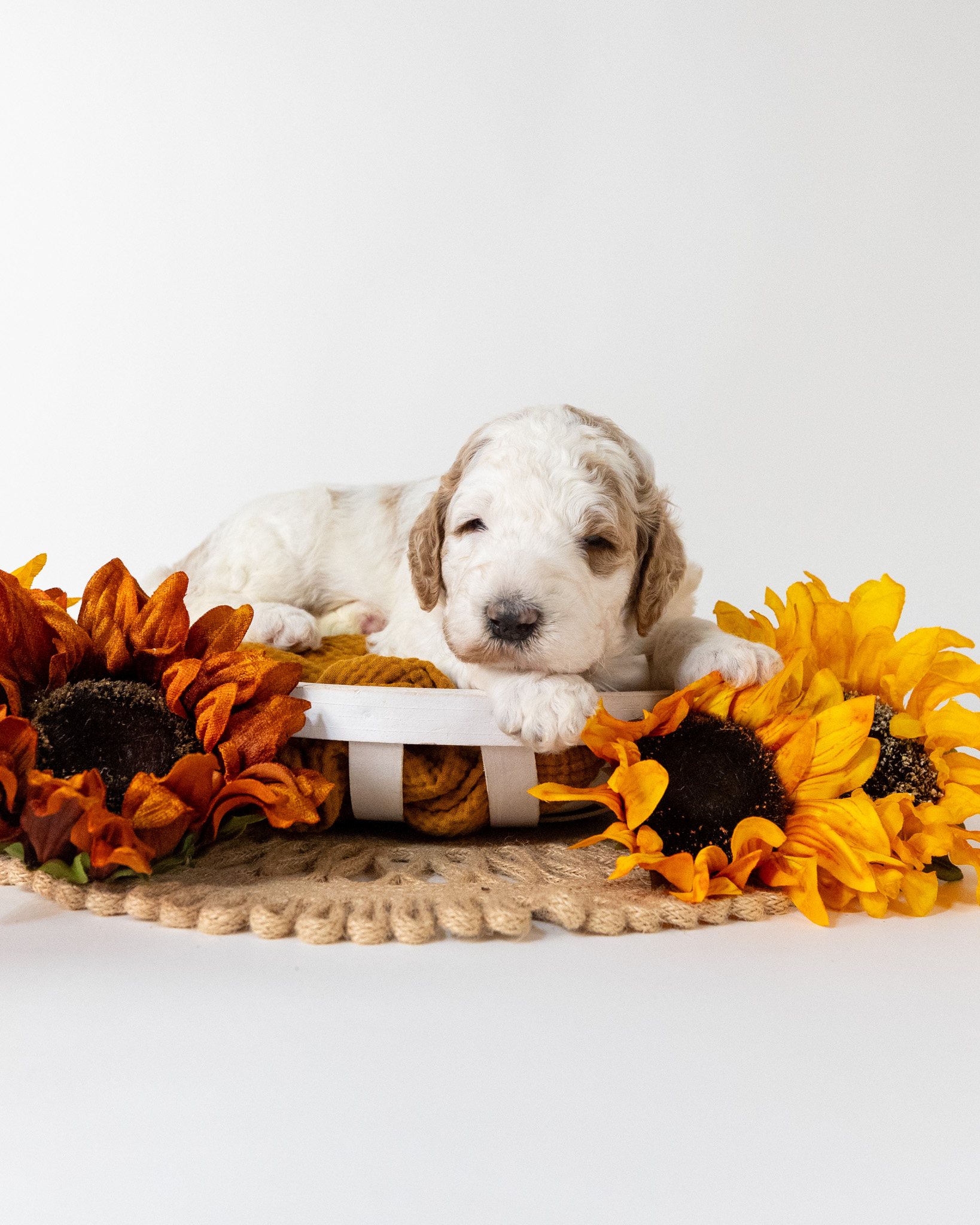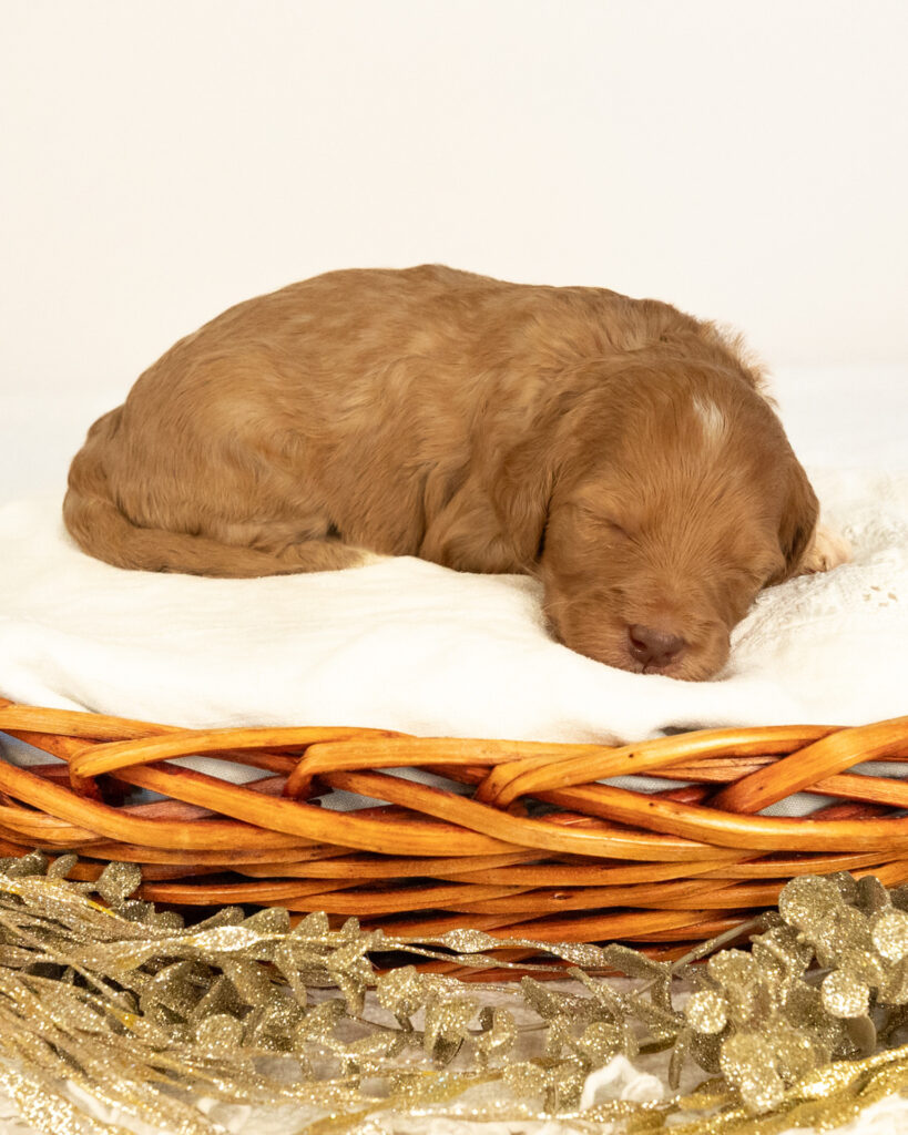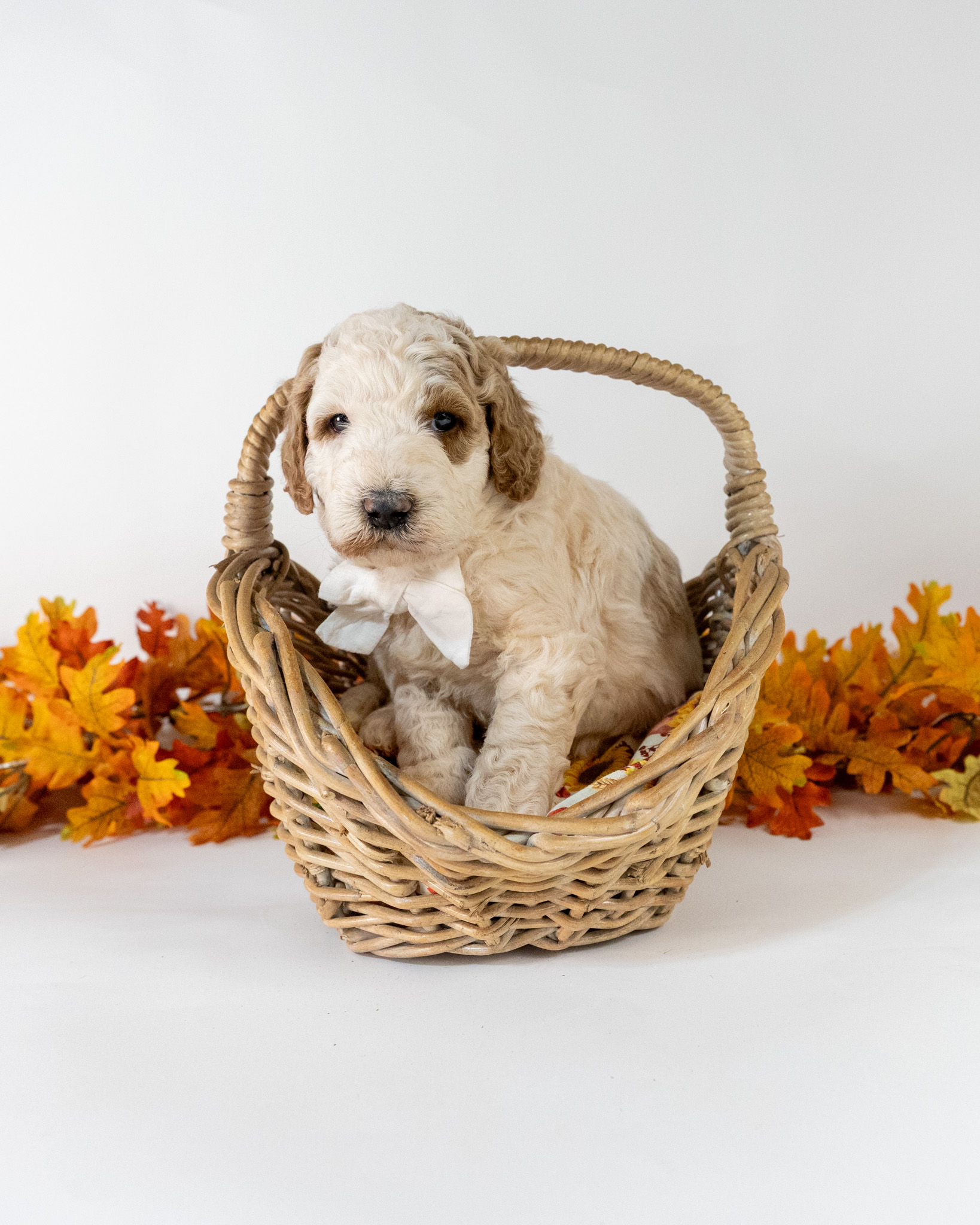 Olaf is a standard multigen Goldendoodle puppy who will graduate from our 1 month training program in December! His soft, fluffy coat is hypoallergenic and non-shedding, ensuring endless snuggles without fear of allergic reactions.