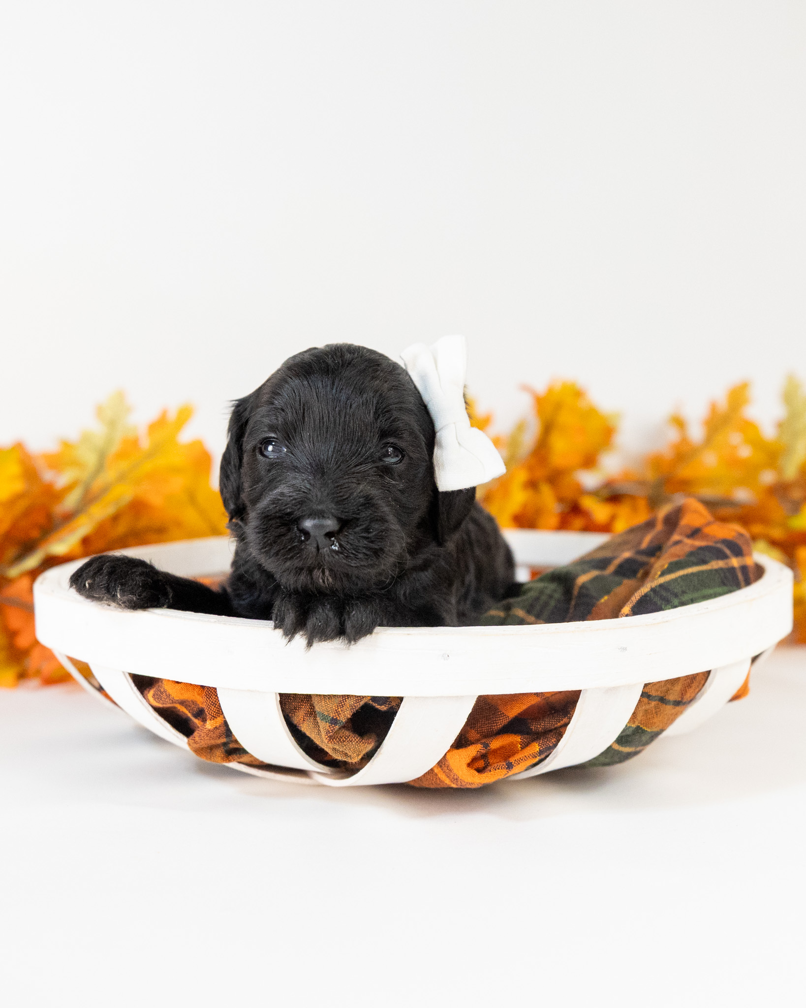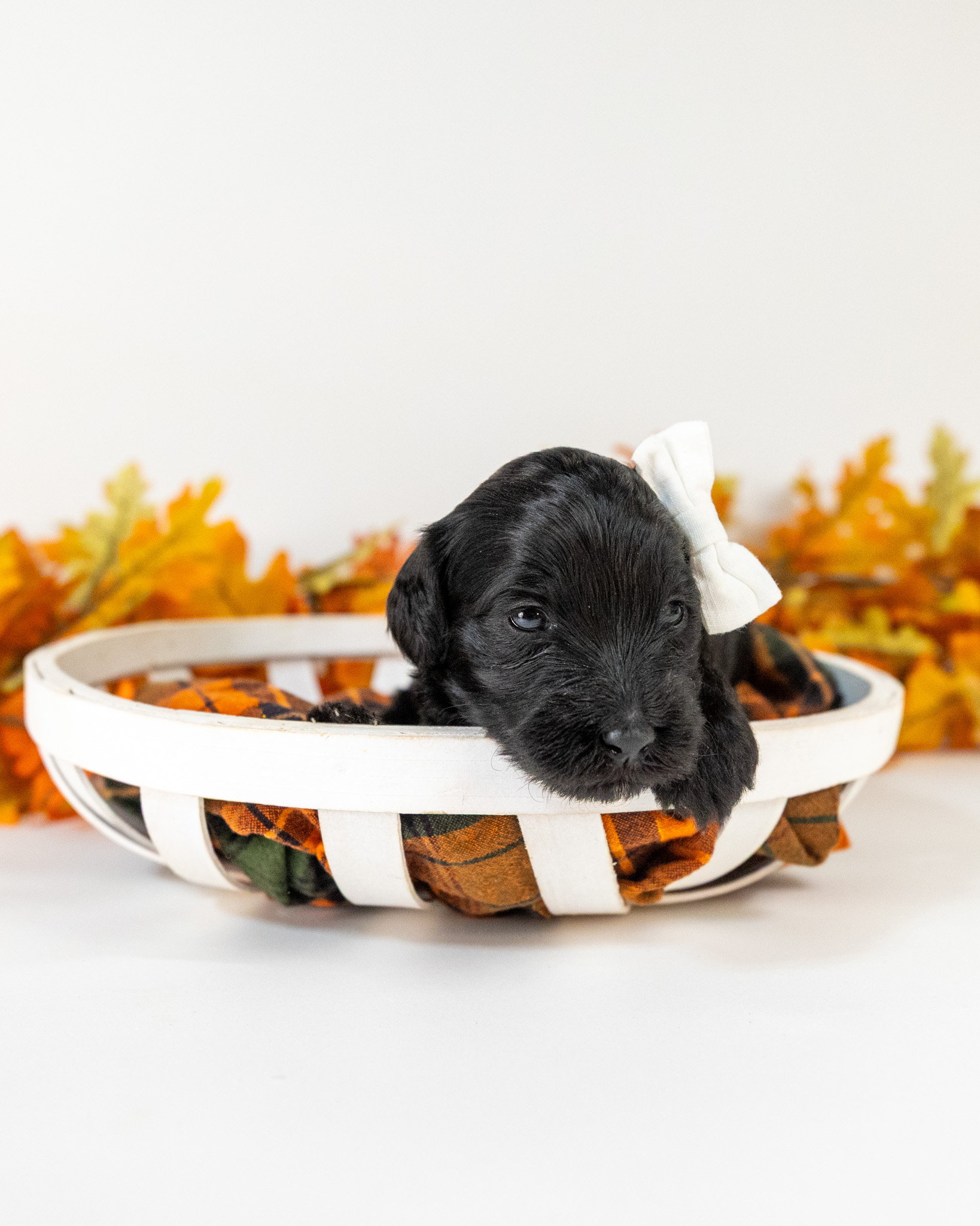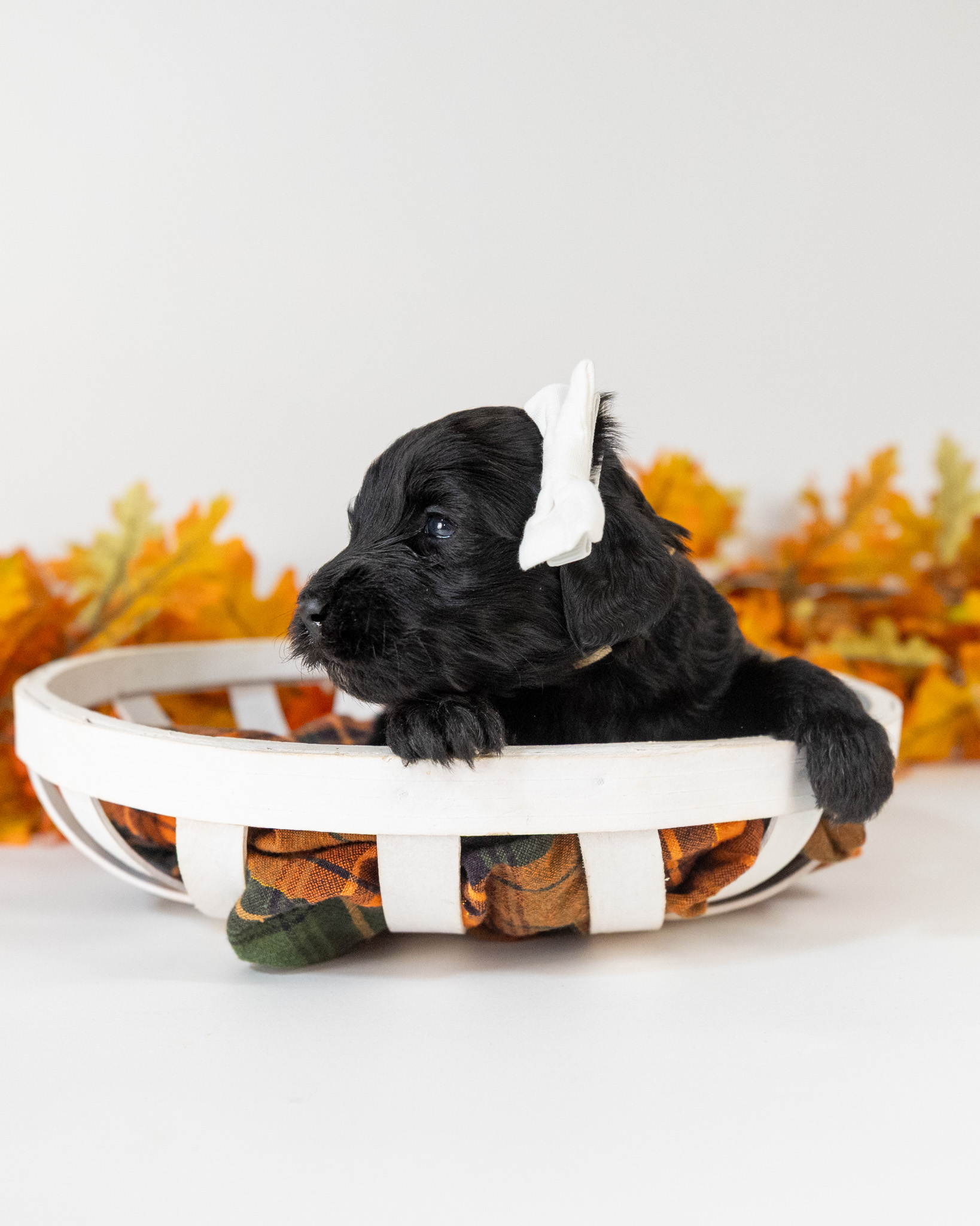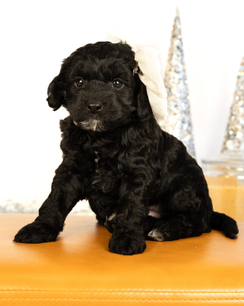 Blitzen is a black multigen Goldendoodle puppy who will be ready for her fur-ever home around December 16th! Her soft, fluffy coat is hypoallergenic and non-shedding, ensuring endless snuggles without fear of allergic reactions. With a loyal and affectionate temperament, she is the perfect forever friend!