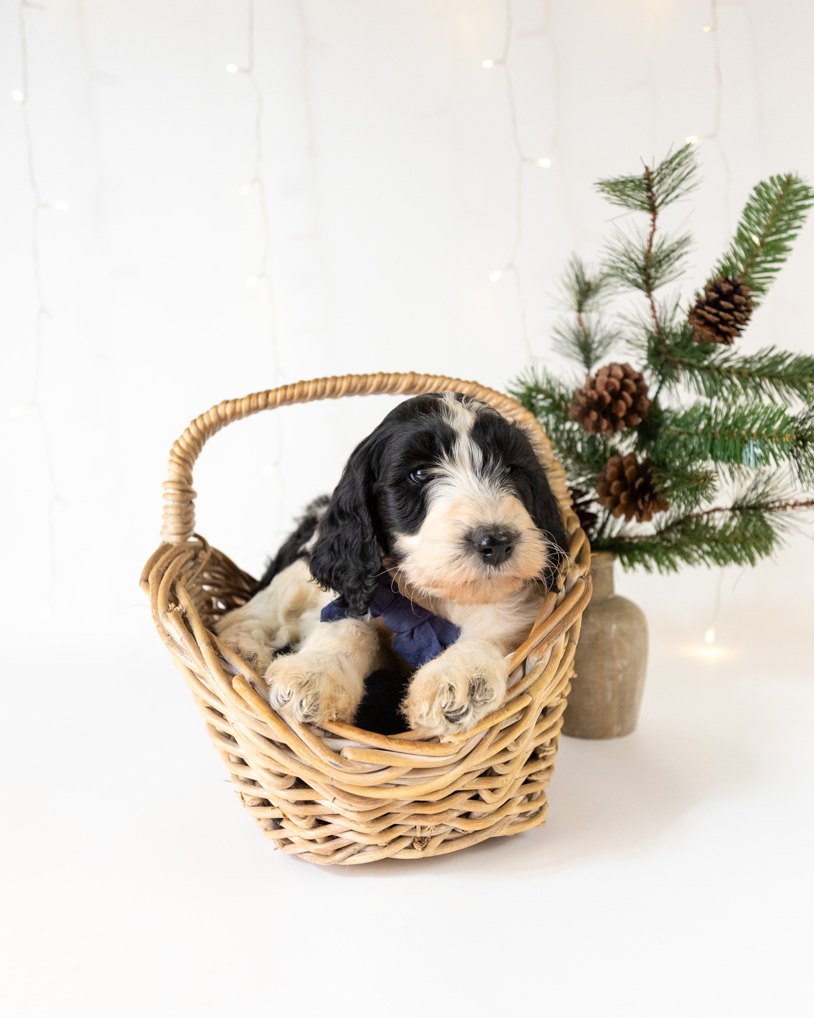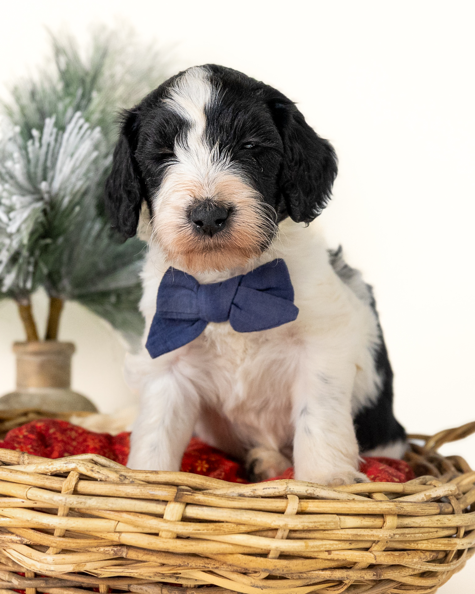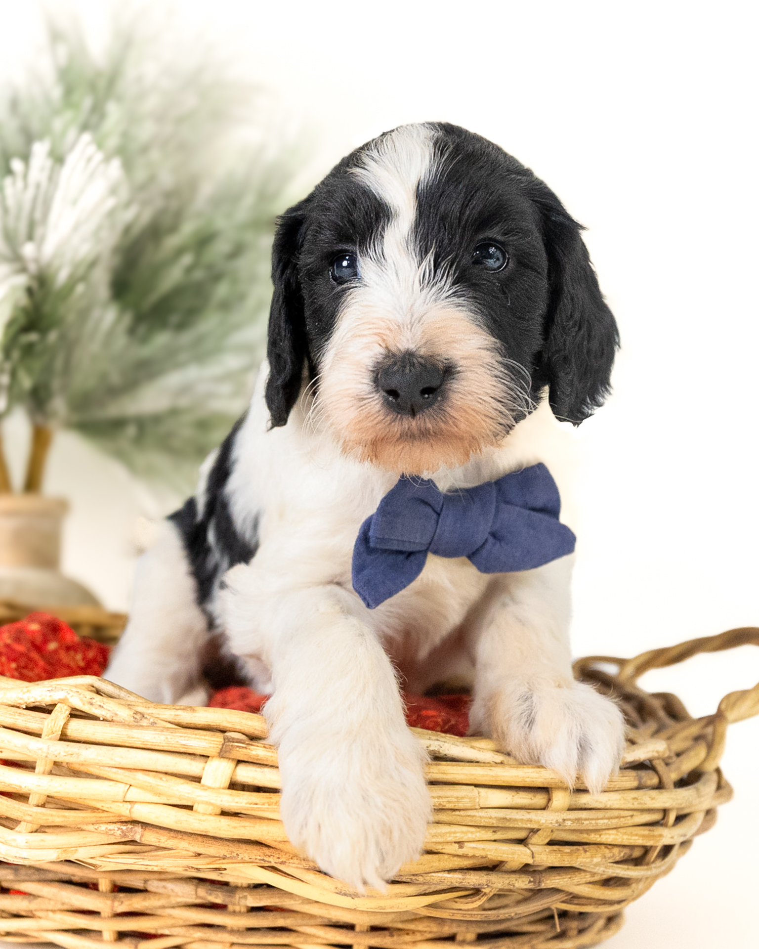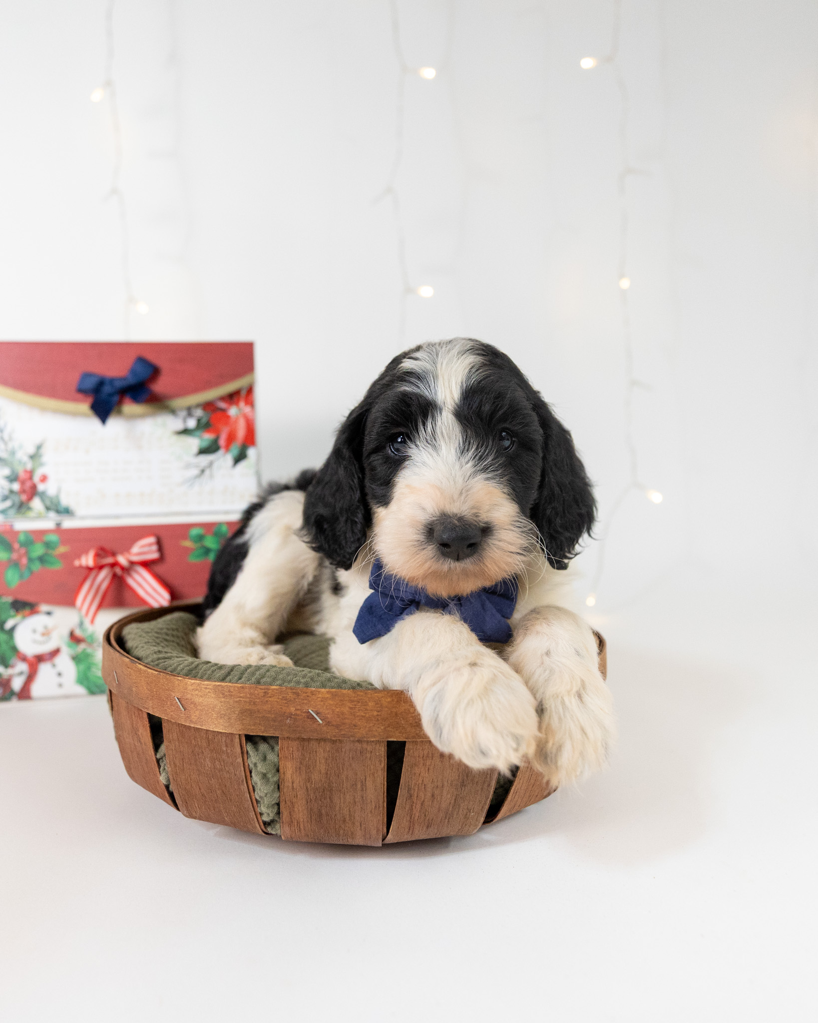 Santa Paws is a black and white parti multigen Goldendoodle puppy who will be ready for his fur-ever home around December 16th! His soft, fluffy coat is hypoallergenic and non-shedding, ensuring endless snuggles without fear of allergic reactions. With a loyal and affectionate temperament, he is the perfect forever friend!
