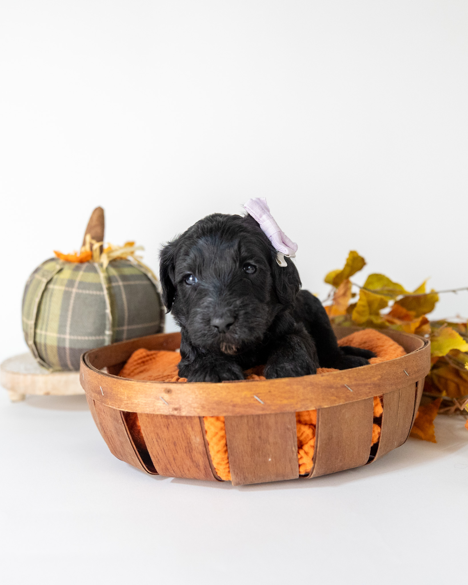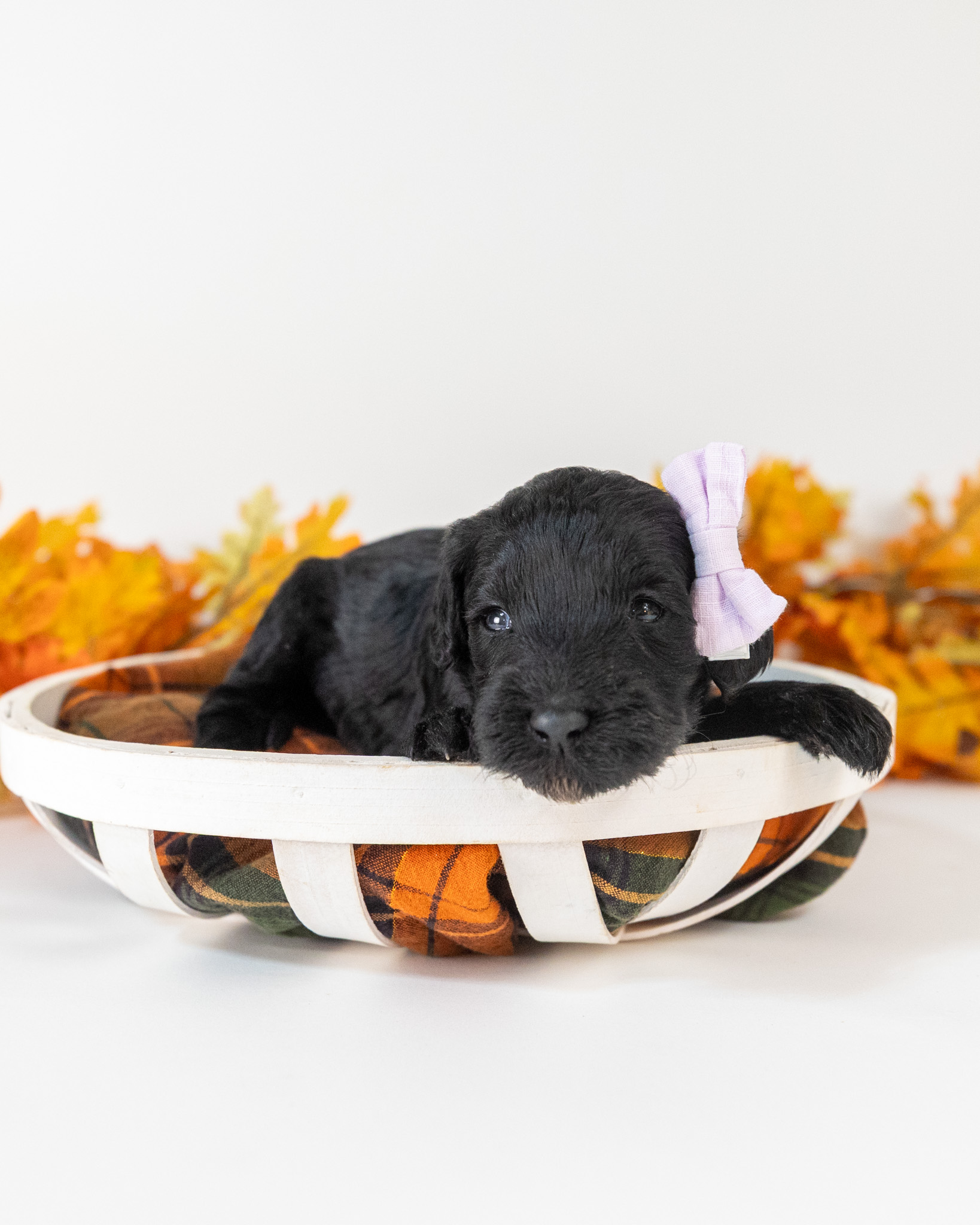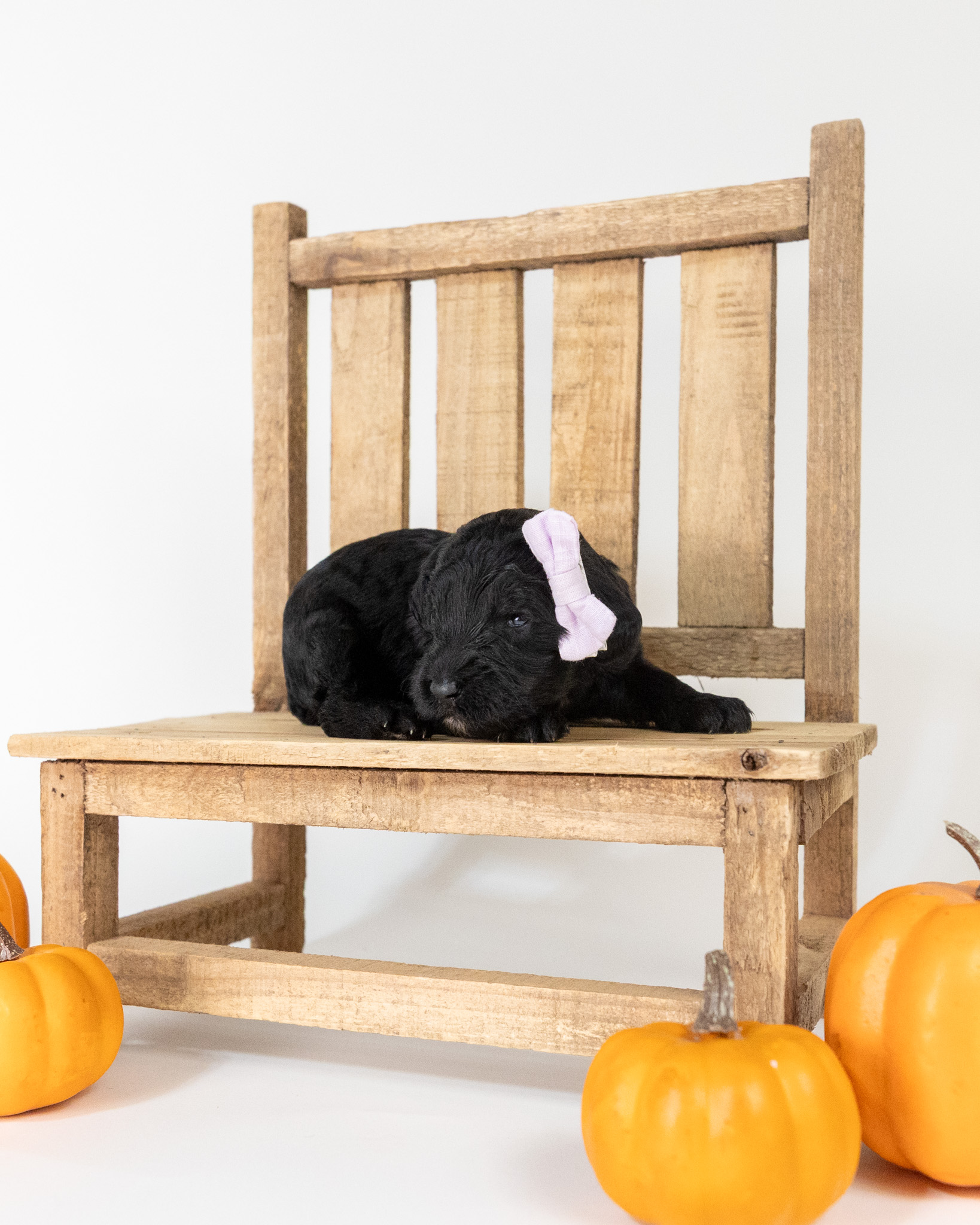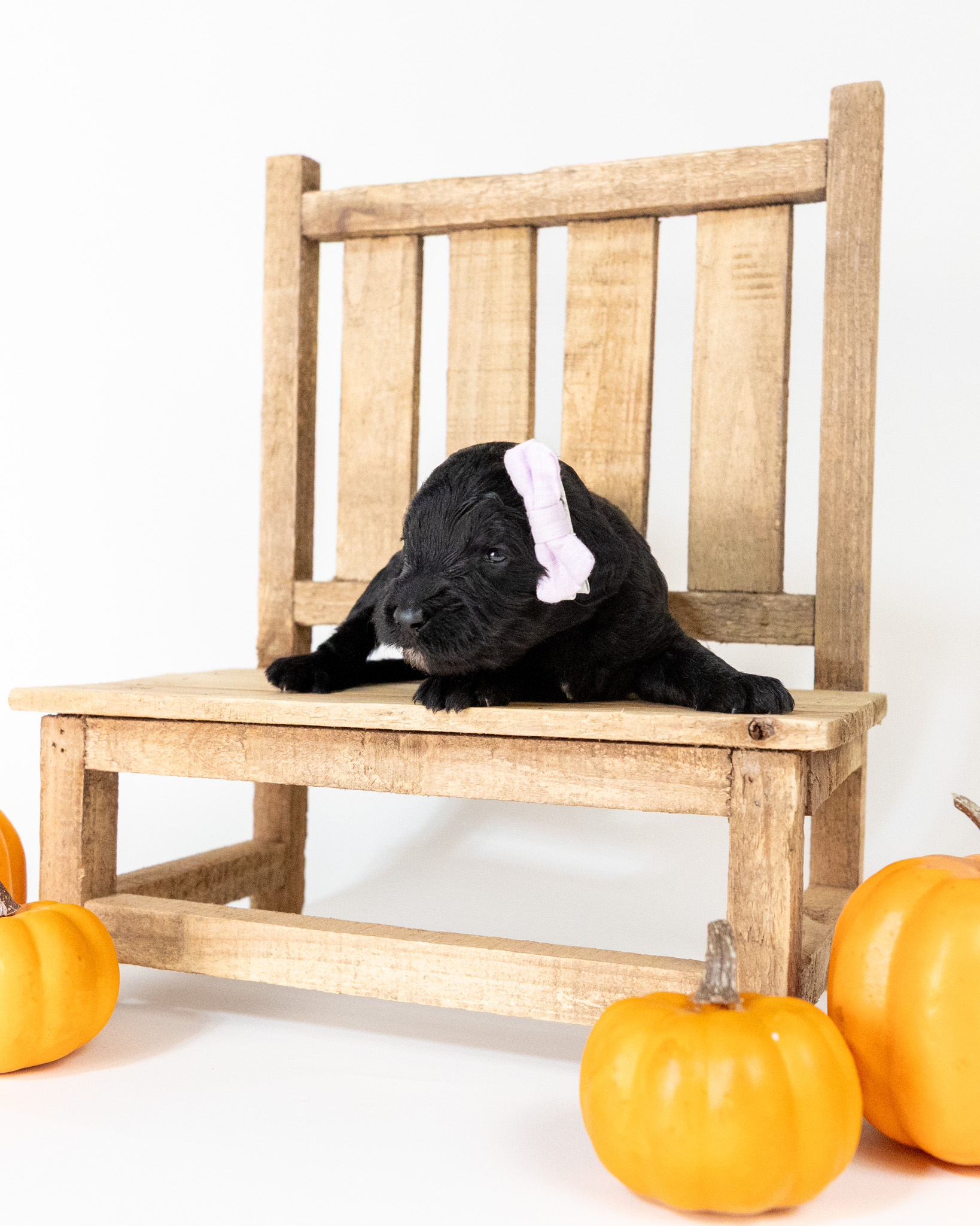 Vixen is a black multigen Goldendoodle puppy who will be ready for her fur-ever home around December 16th! Her soft, fluffy coat is hypoallergenic and non-shedding, ensuring endless snuggles without fear of allergic reactions. With a loyal and affectionate temperament, she is the perfect forever friend!