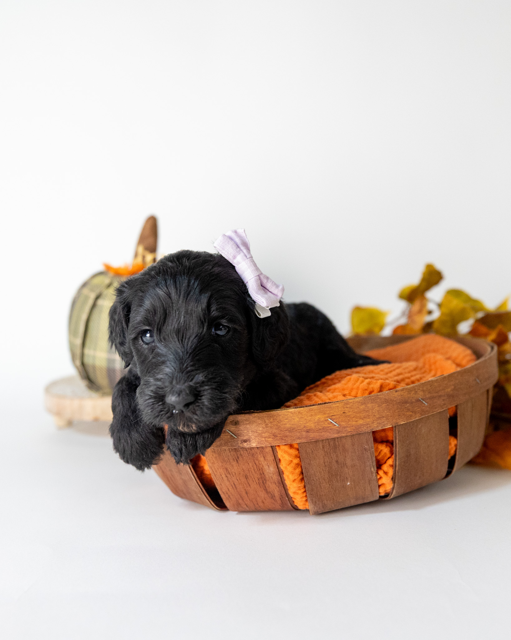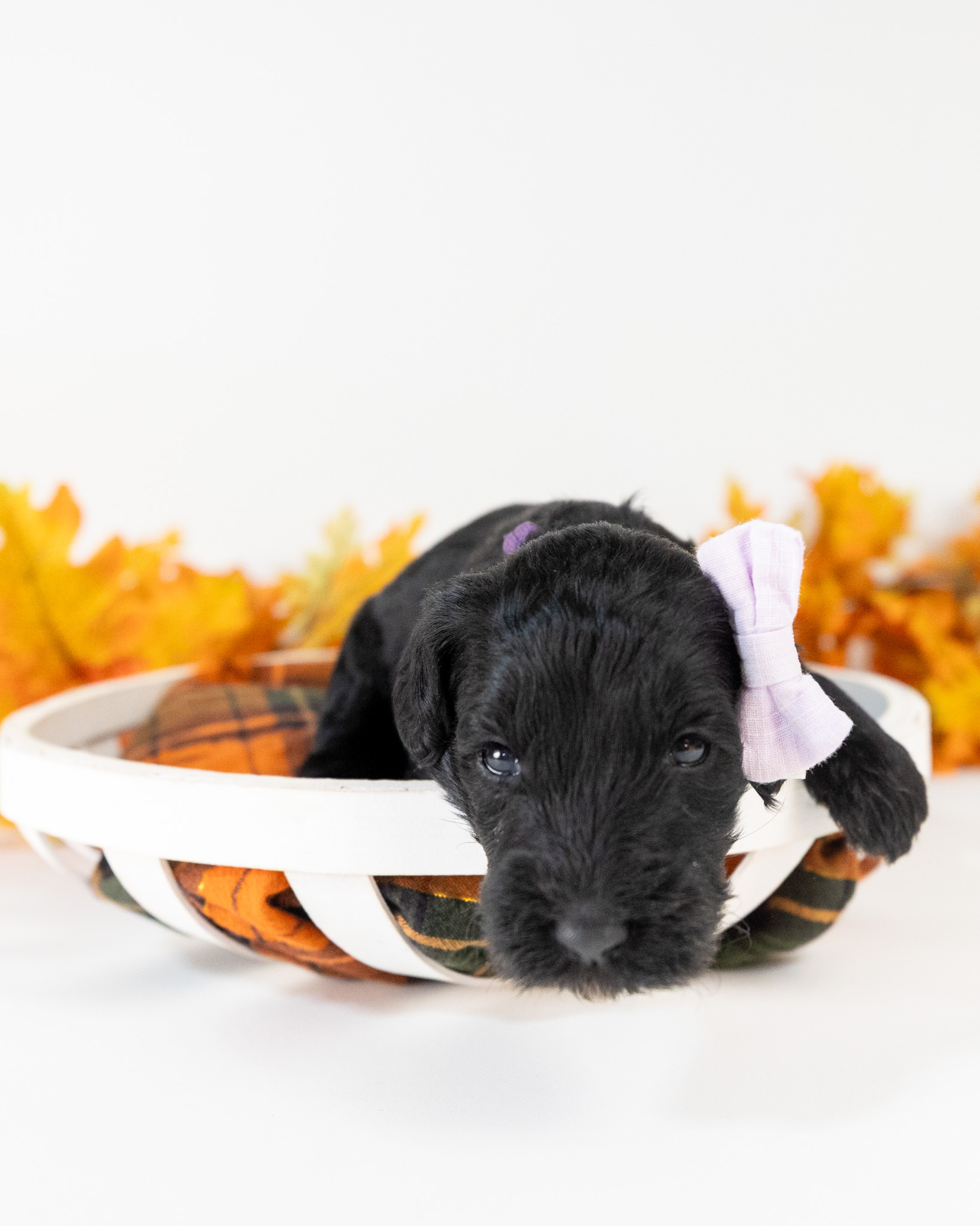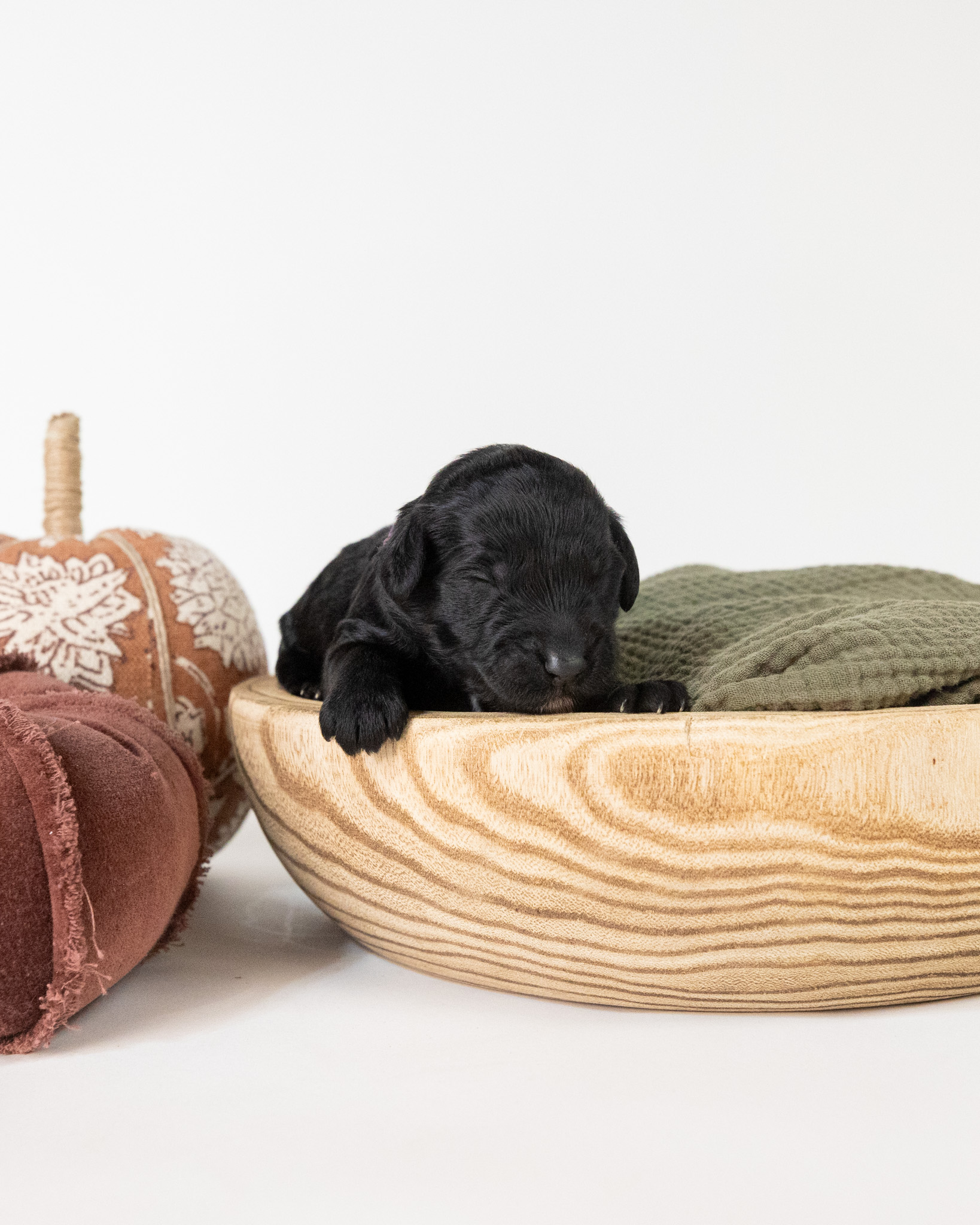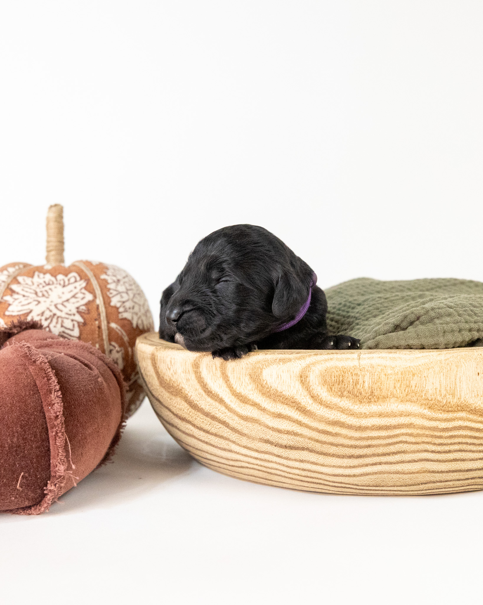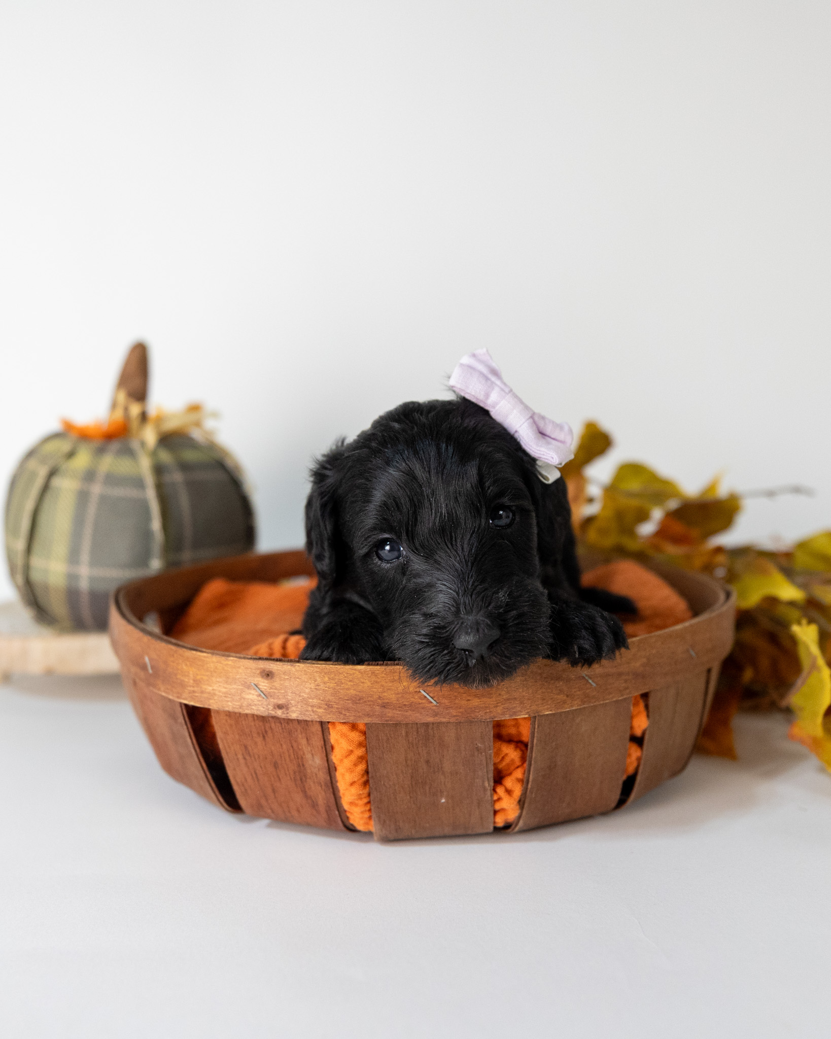 Vixen is a black multigen Goldendoodle puppy who will be ready for her fur-ever home around December 16th! Her soft, fluffy coat is hypoallergenic and non-shedding, ensuring endless snuggles without fear of allergic reactions. With a loyal and affectionate temperament, she is the perfect forever friend!