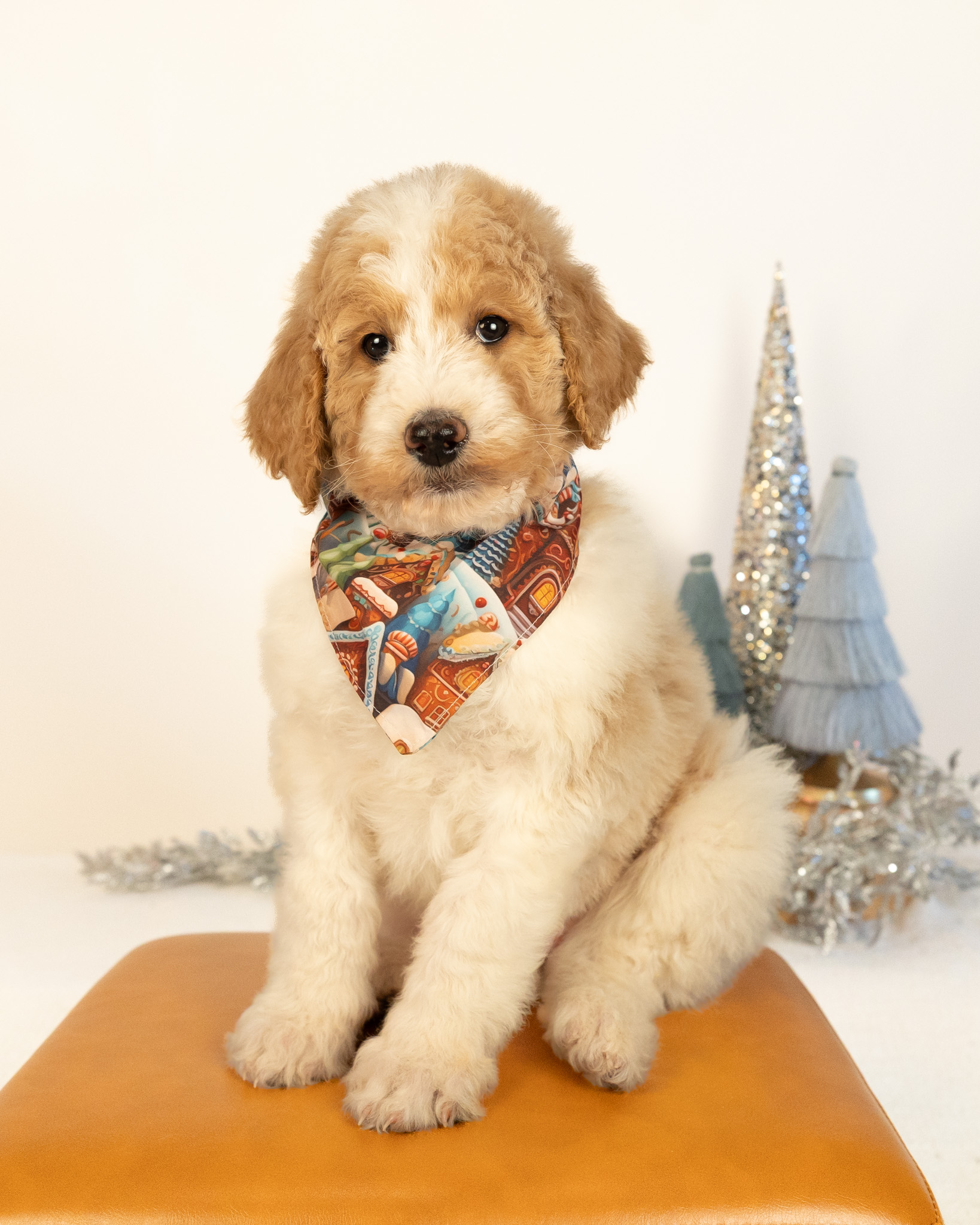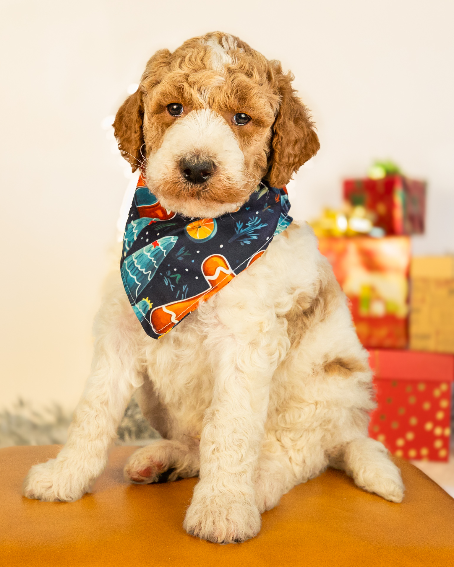 Louis (LOO-ee) is a multigen standard Goldendoodle puppy who will be ready for his fur-ever home around December 9th! His soft, fluffy coat is hypoallergenic and non-shedding, ensuring endless snuggles without fear of allergic reactions. With a loyal and affectionate temperament, he is the perfect forever friend!