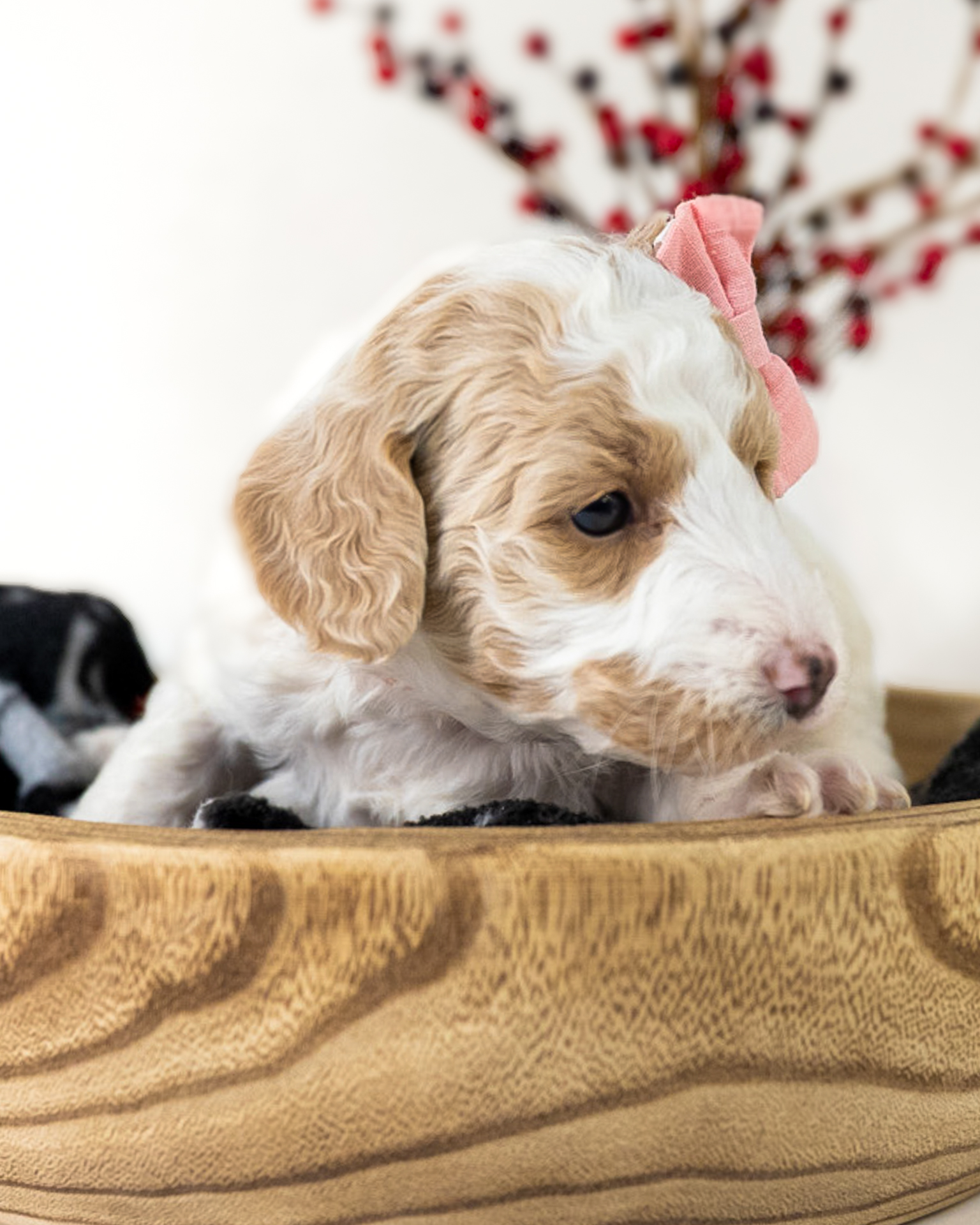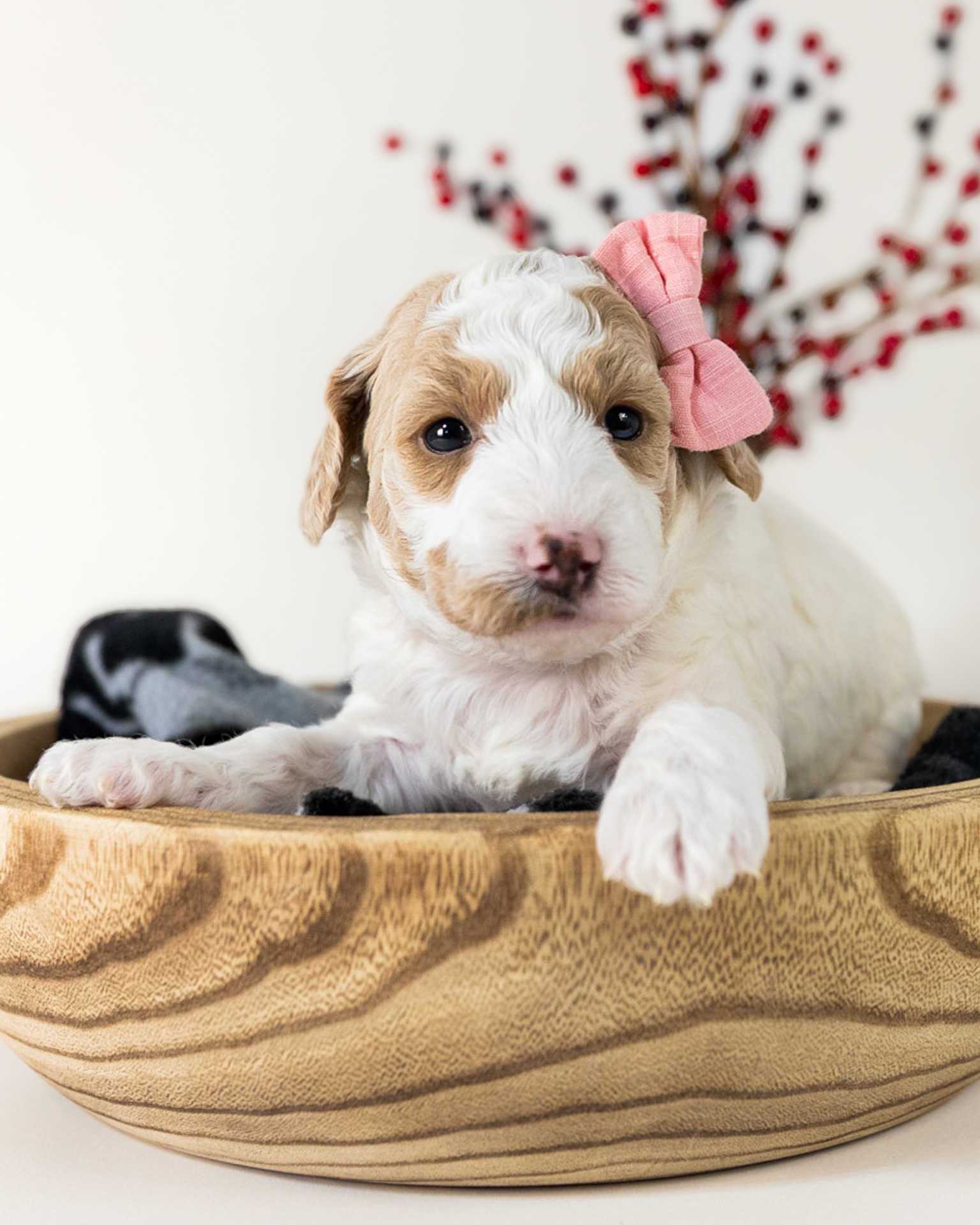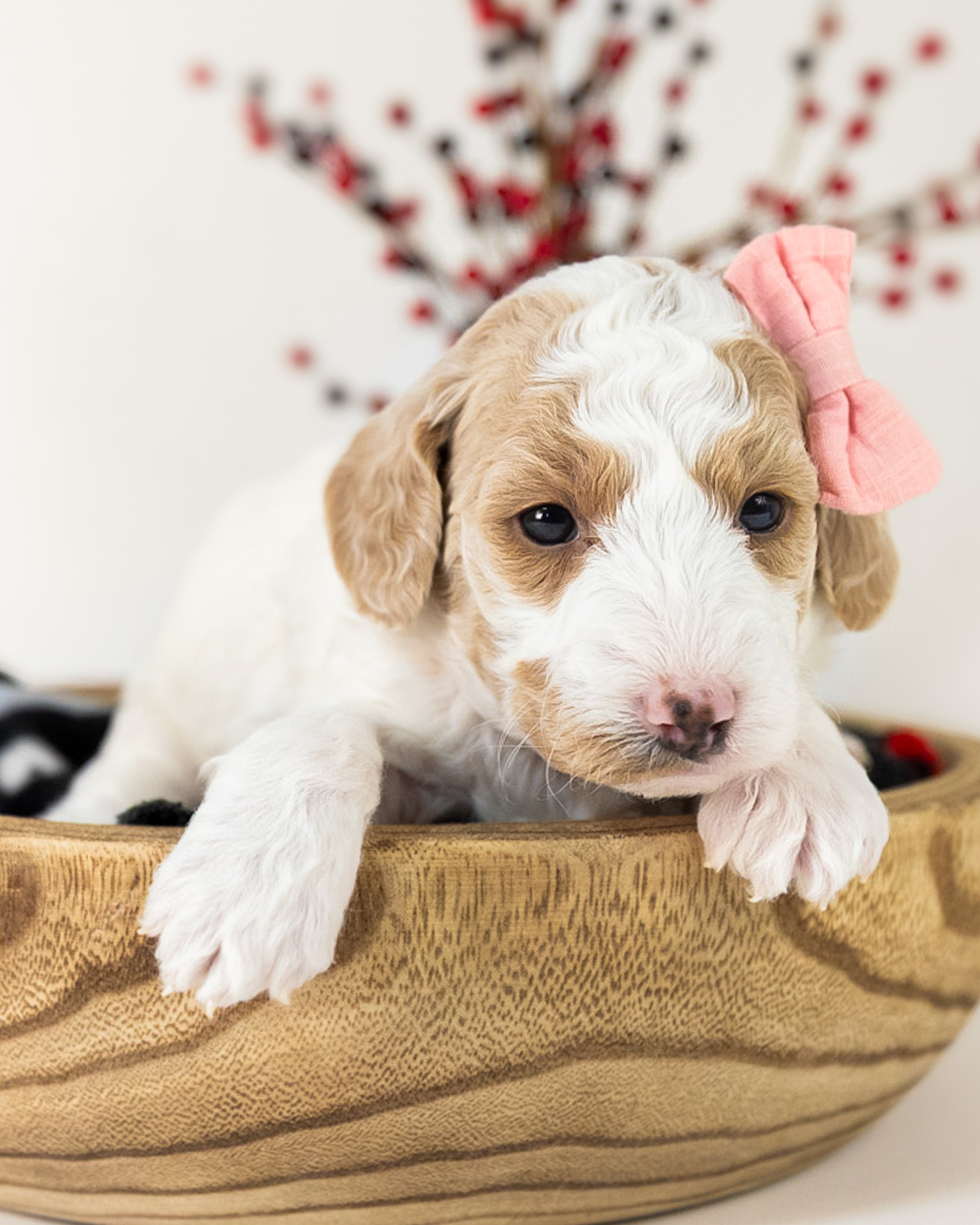 Anna is a multigen mini Goldendoodle puppy who will be ready for her fur-ever home December 24th! Her soft, fluffy coat is hypoallergenic and non-shedding, ensuring endless snuggles without fear of allergic reactions. With a loyal and affectionate temperament, she is the perfect forever friend!