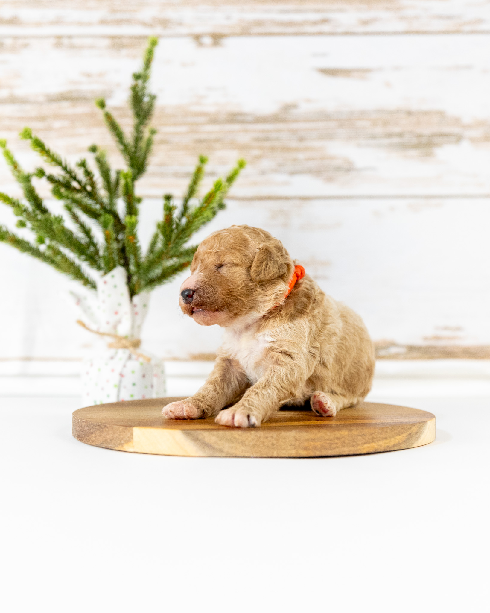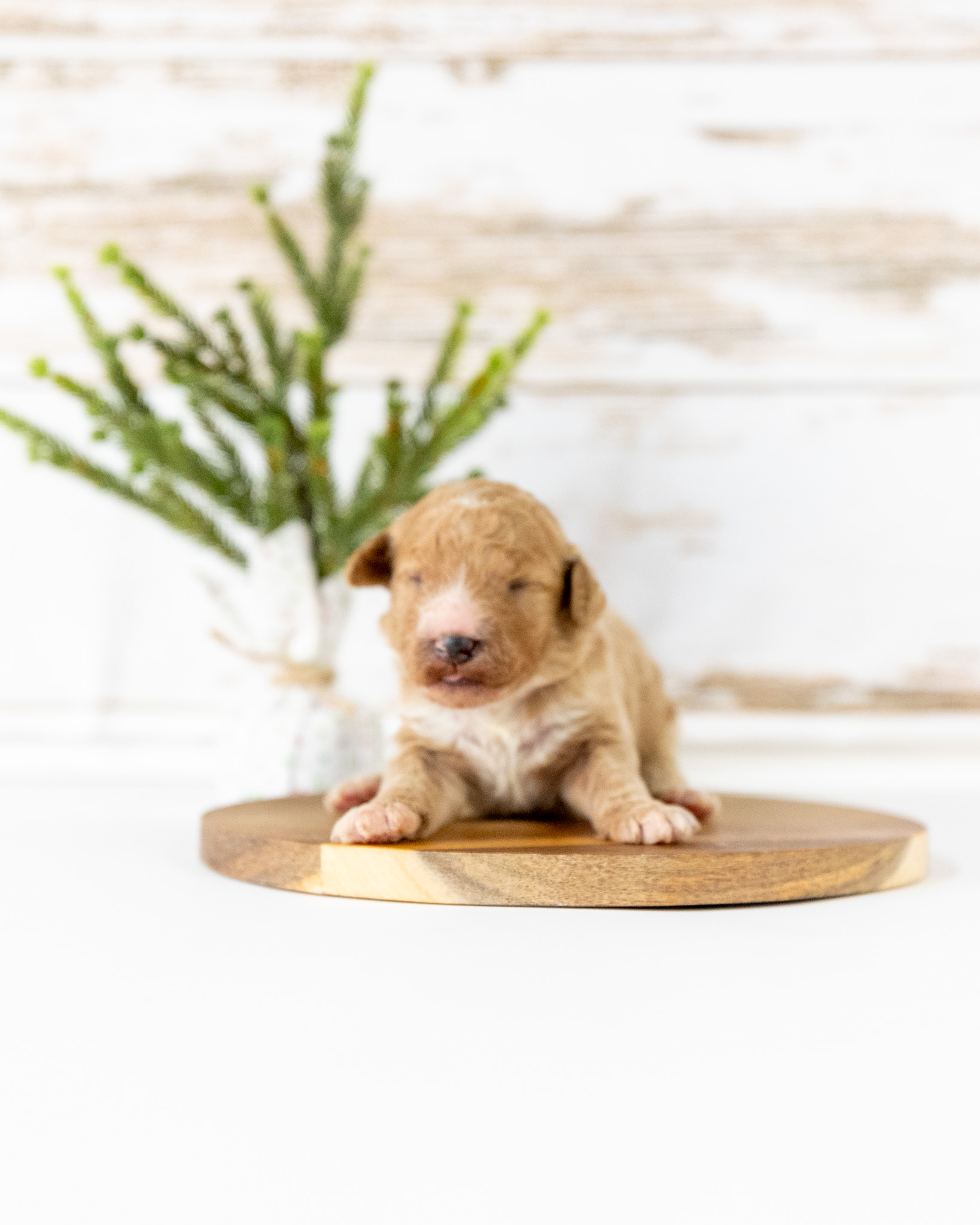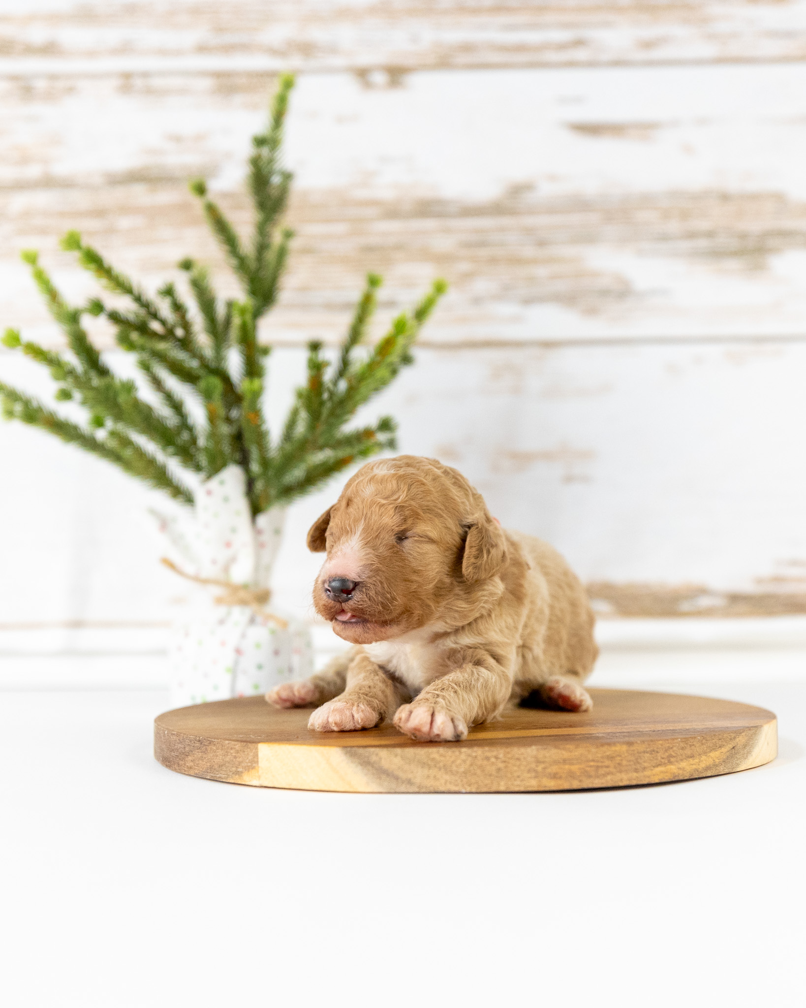 Twinkle is a standard multigen Goldendoodle puppy who will be ready for her forever home February 12th! Her soft, fluffy coat is hypoallergenic and non-shedding, ensuring endless snuggles without fear of allergic reactions.