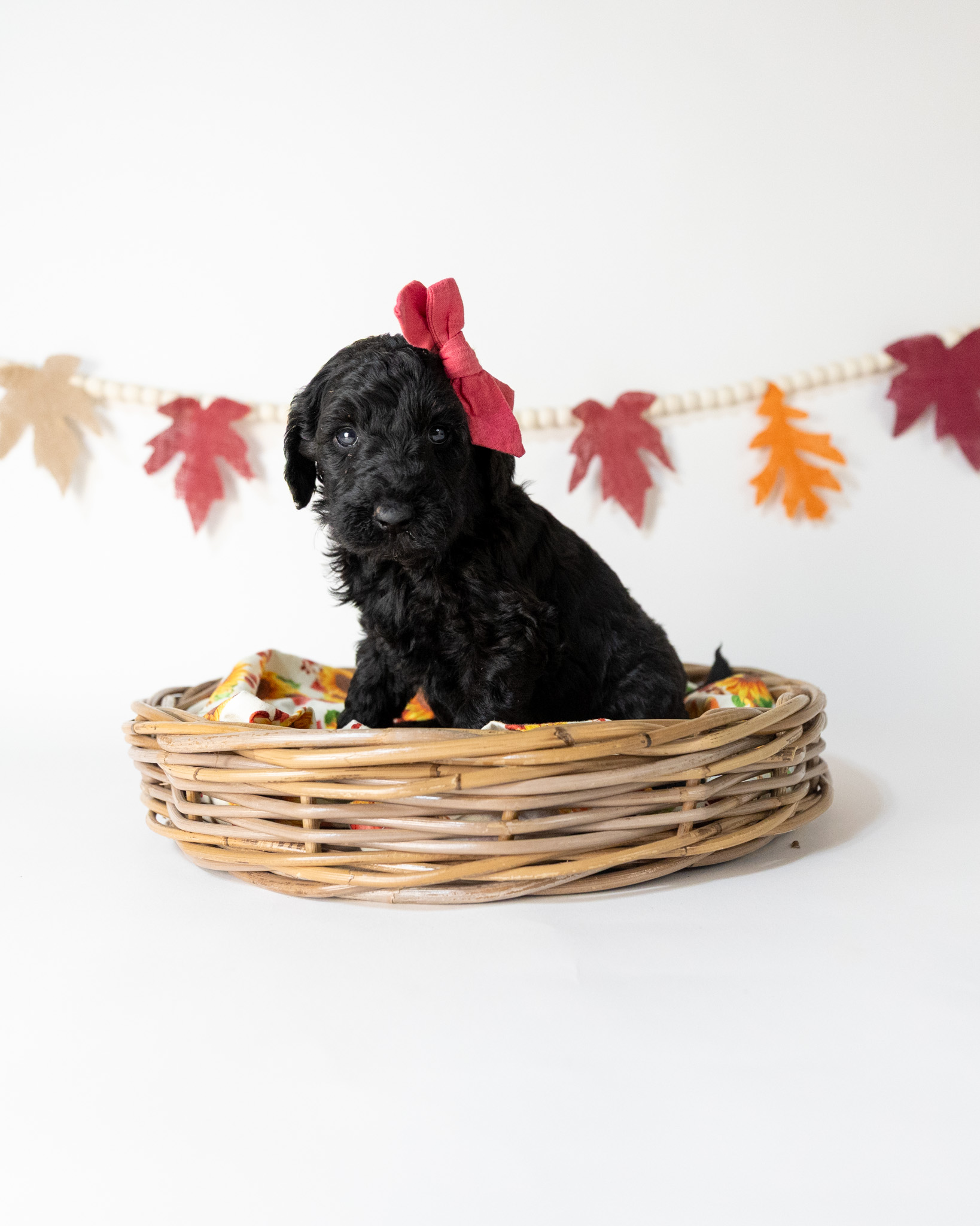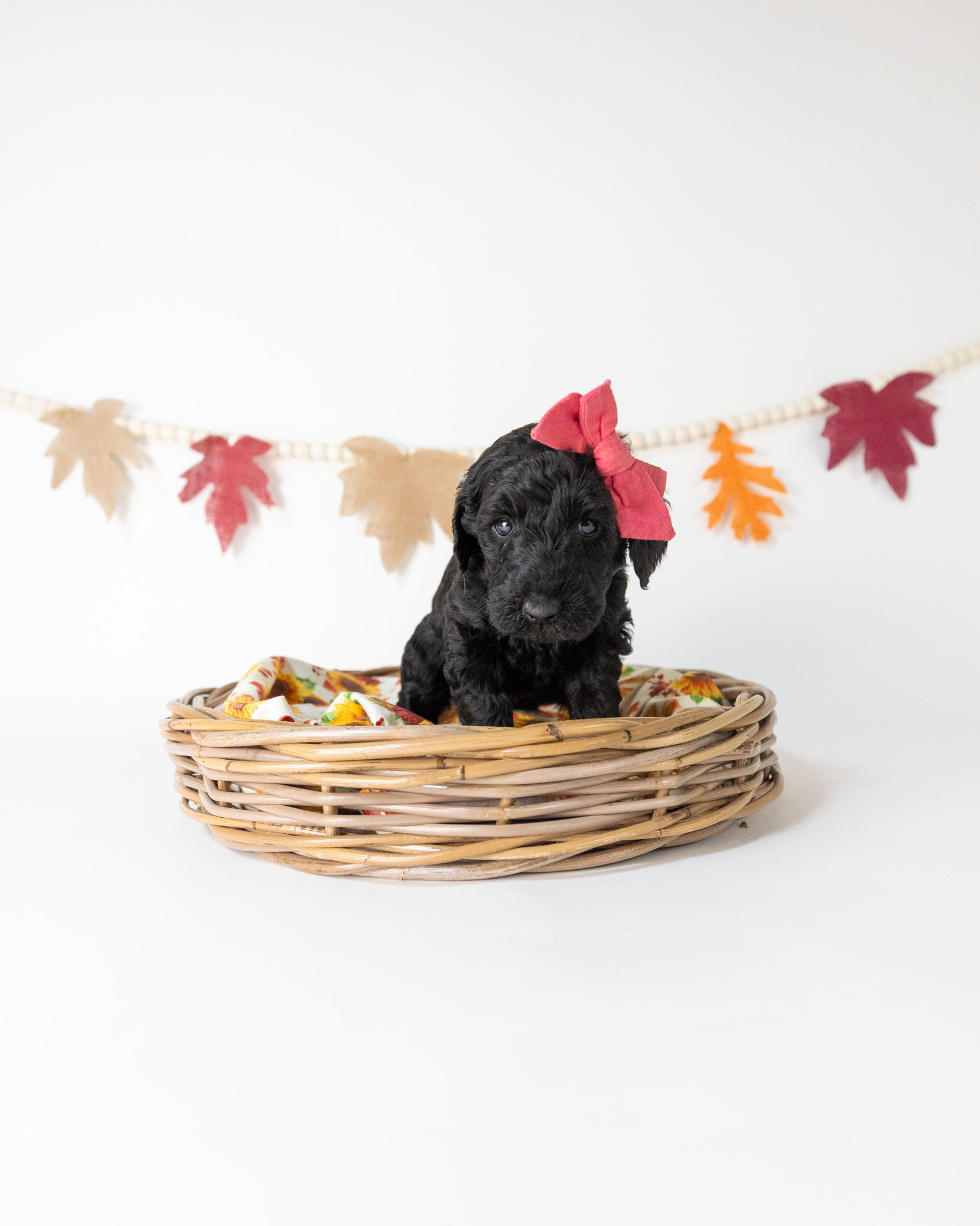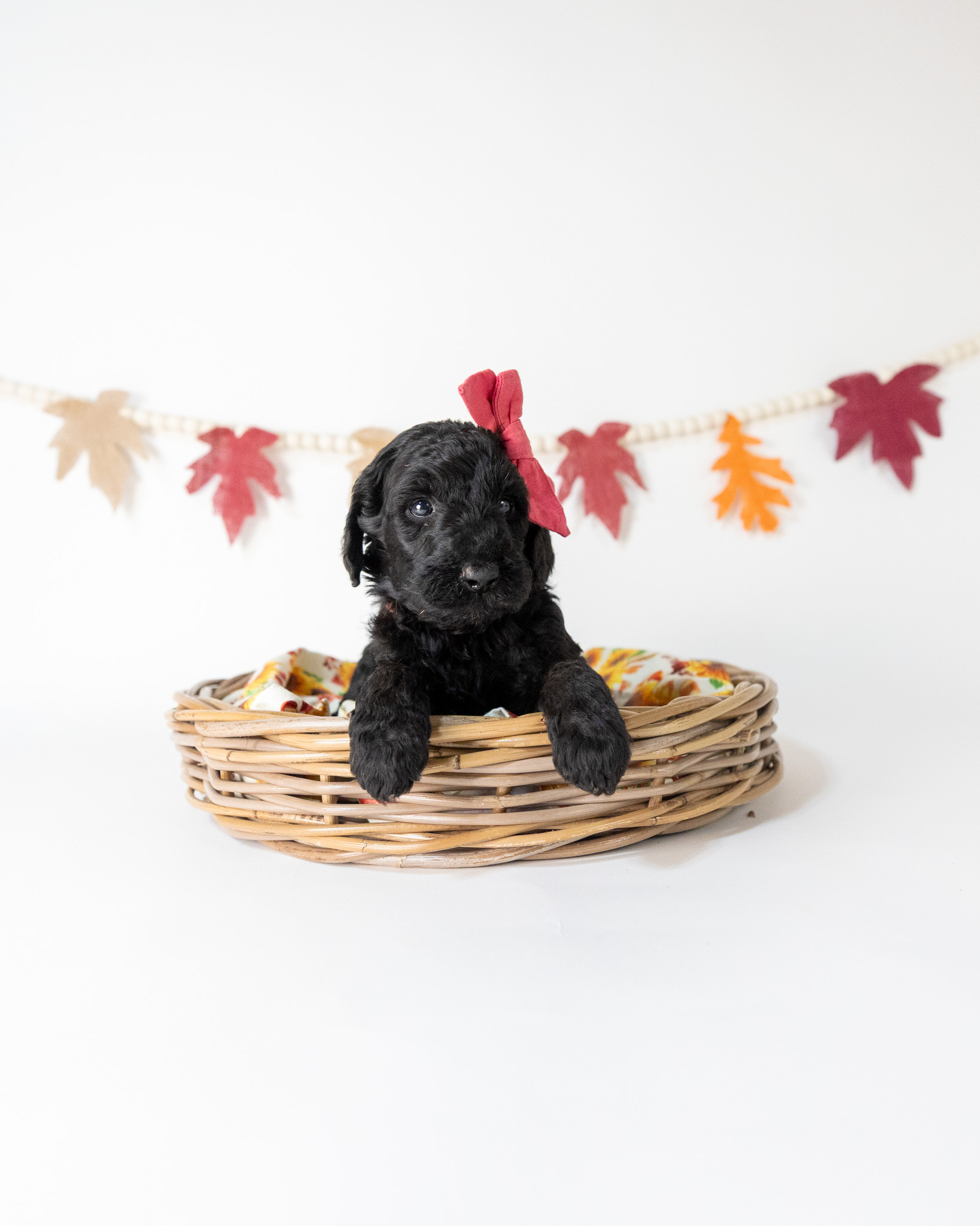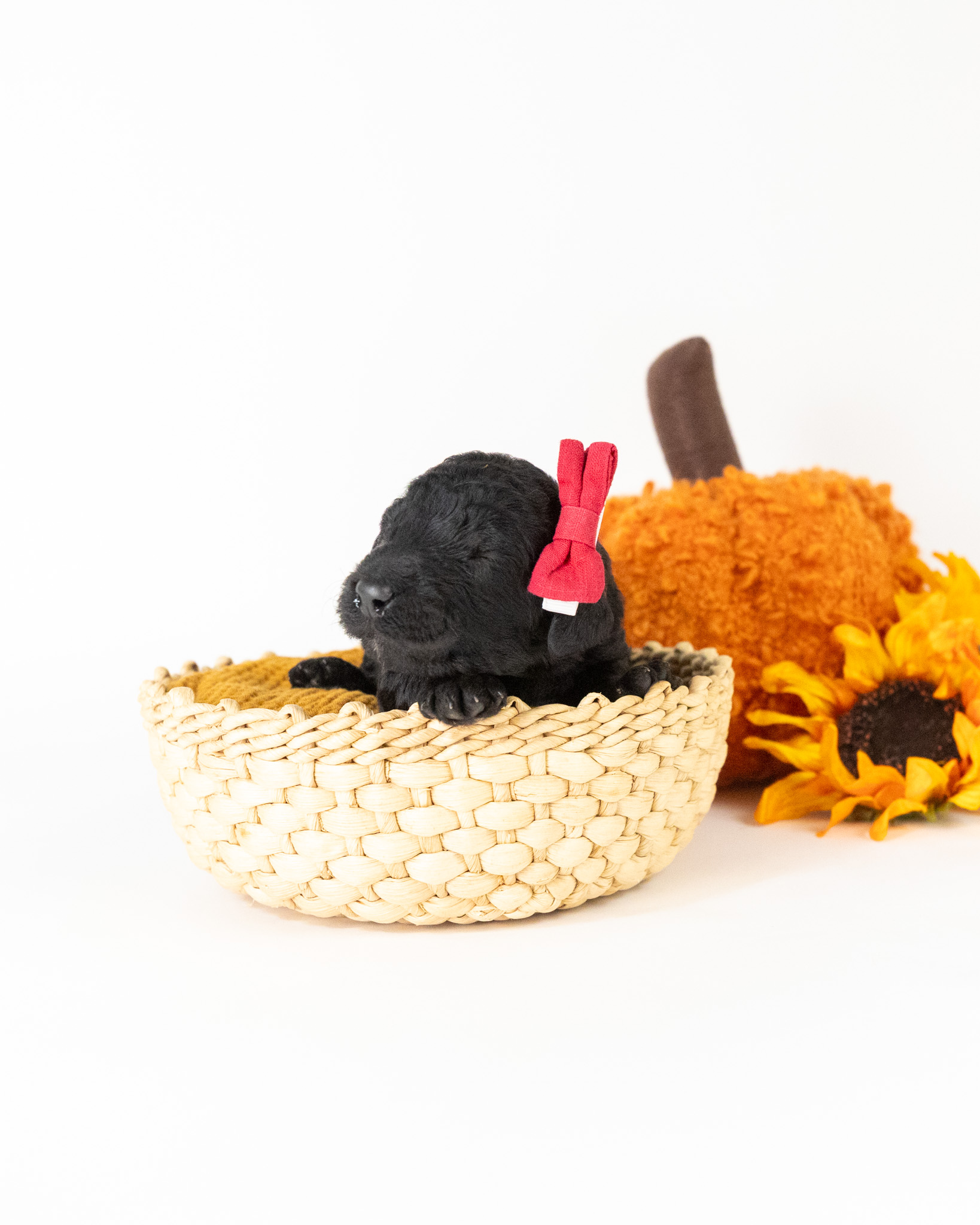Ribbon is a multigen Goldendoodle puppy who will be ready for her fur-ever home around December 11th! Her soft, fluffy coat is hypoallergenic and non-shedding, ensuring endless snuggles without fear of allergic reactions. With a loyal and affectionate temperament, she is the perfect forever friend!