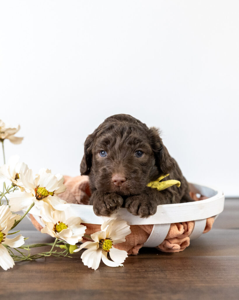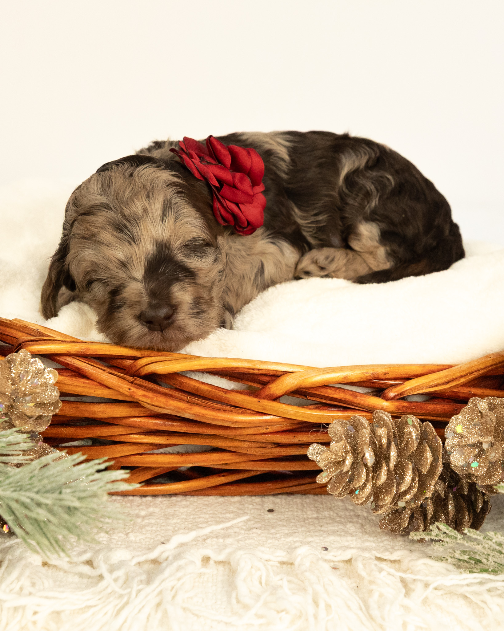 Holly is a multigen medium Goldendoodle puppy who will be ready for her fur-ever home around January 14th! Her soft, fluffy coat is hypoallergenic and non-shedding, ensuring endless snuggles without fear of allergic reactions. With a loyal and affectionate temperament, she is the perfect forever friend!