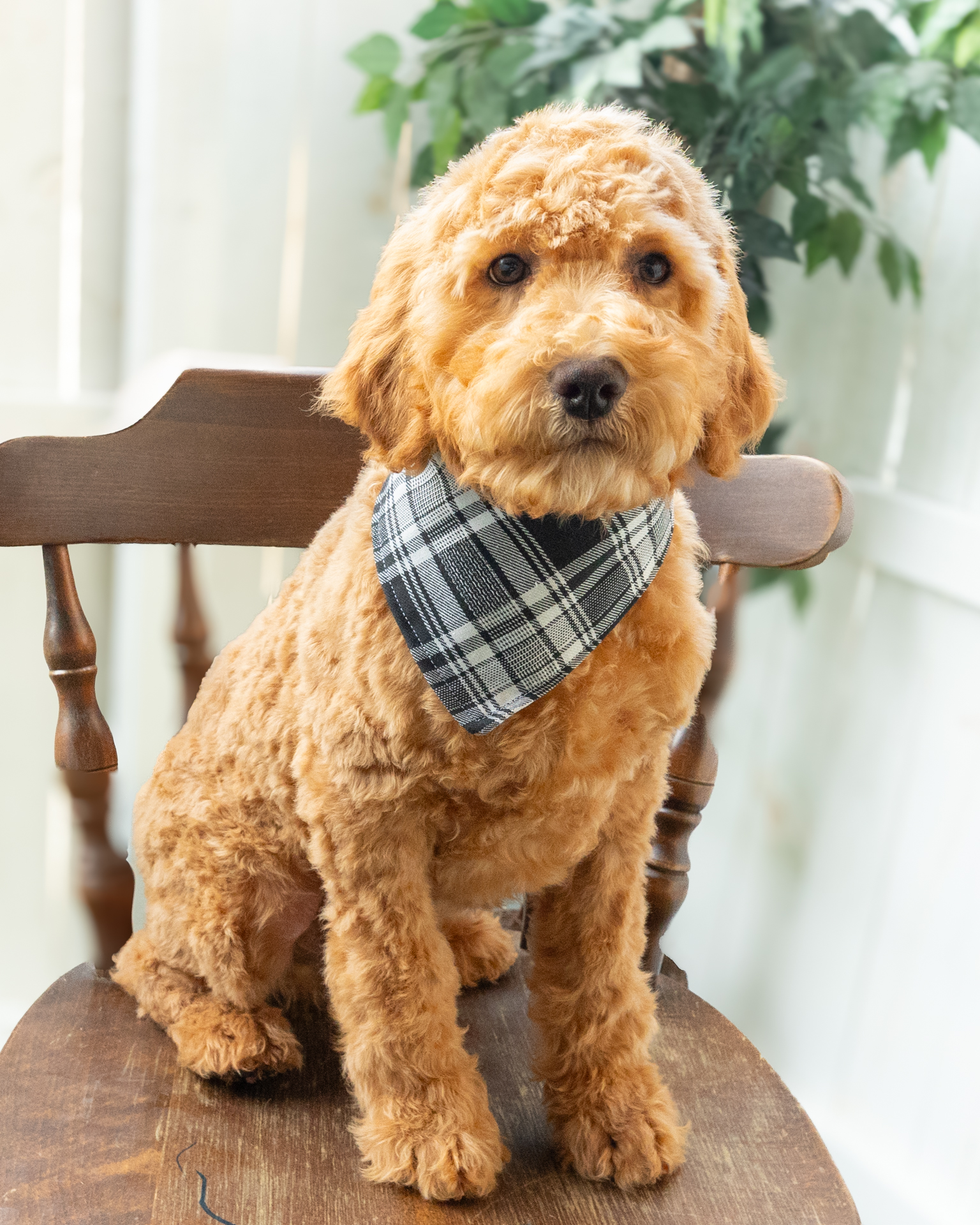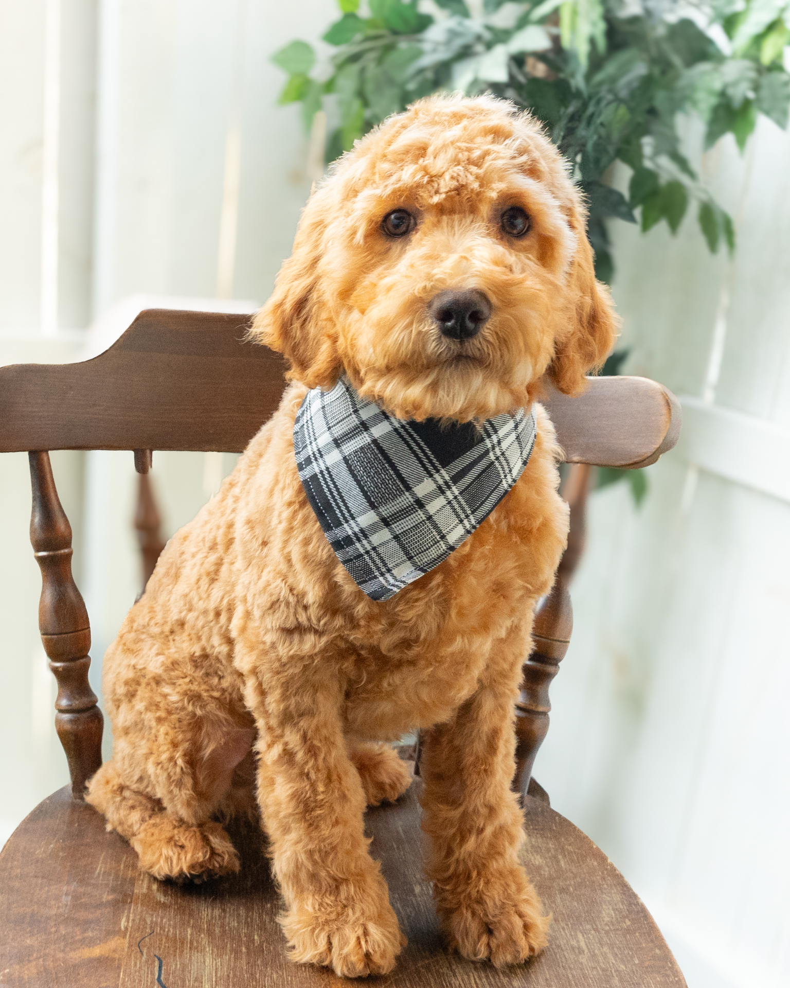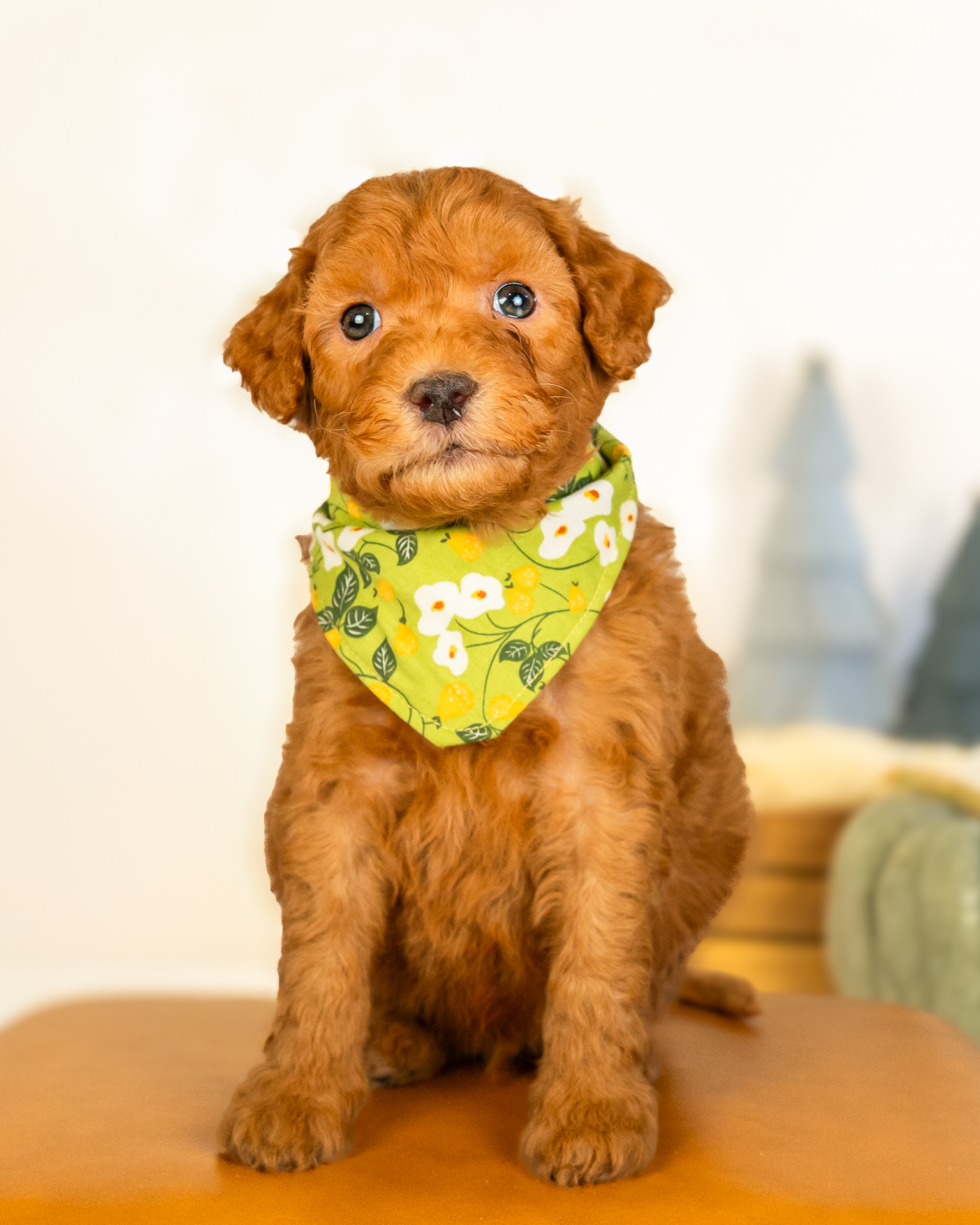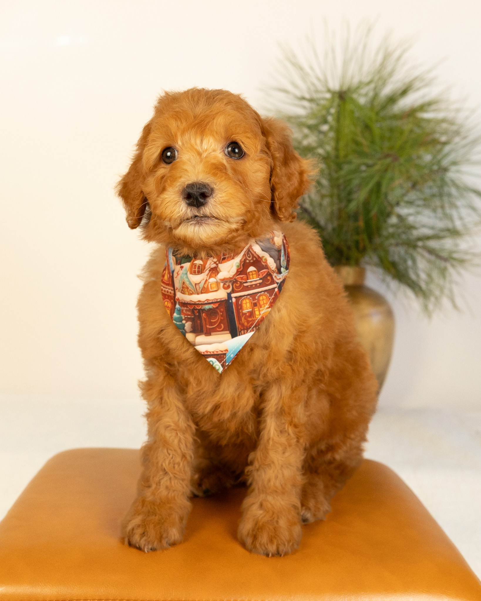 Schroeder is a multigen Goldendoodle puppy who will be ready for his fur-ever home around December 1st! His soft, fluffy coat is hypoallergenic and non-shedding, ensuring endless snuggles without fear of allergic reactions. With a loyal and affectionate temperament, he is the perfect forever friend!
