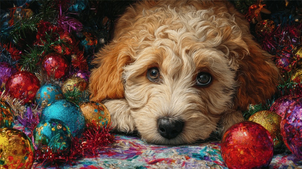 It’s easy to imagine picture-perfect holiday moments, but remember: your doodle is still a baby. There will be accidents, chewed bows, and early wake-ups. That’s all part of the journey.