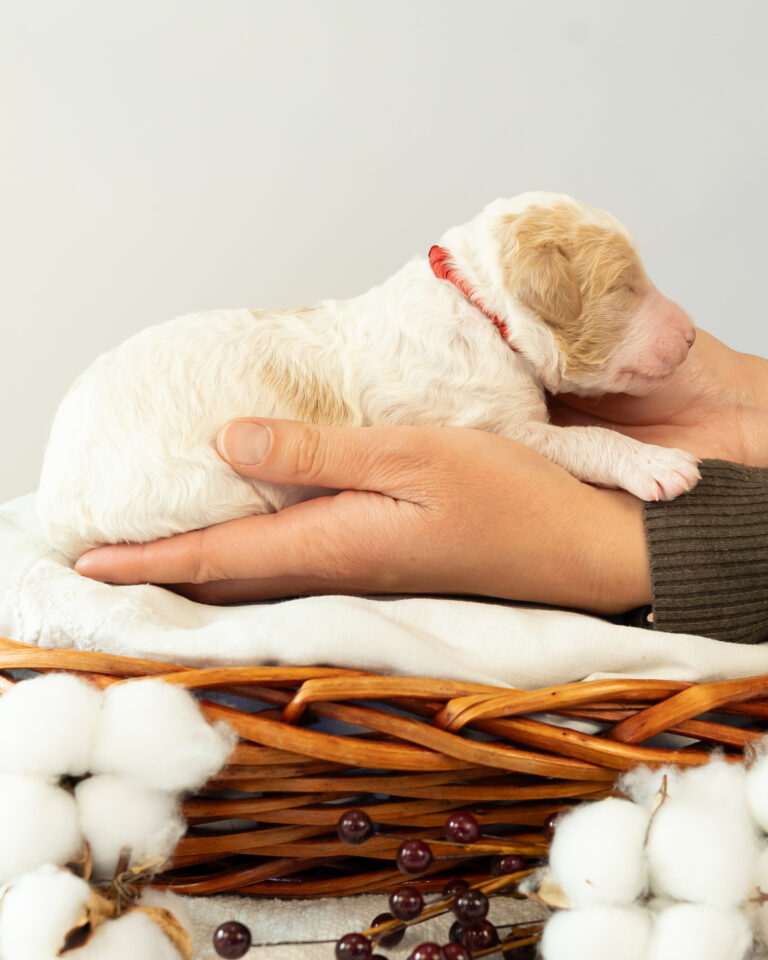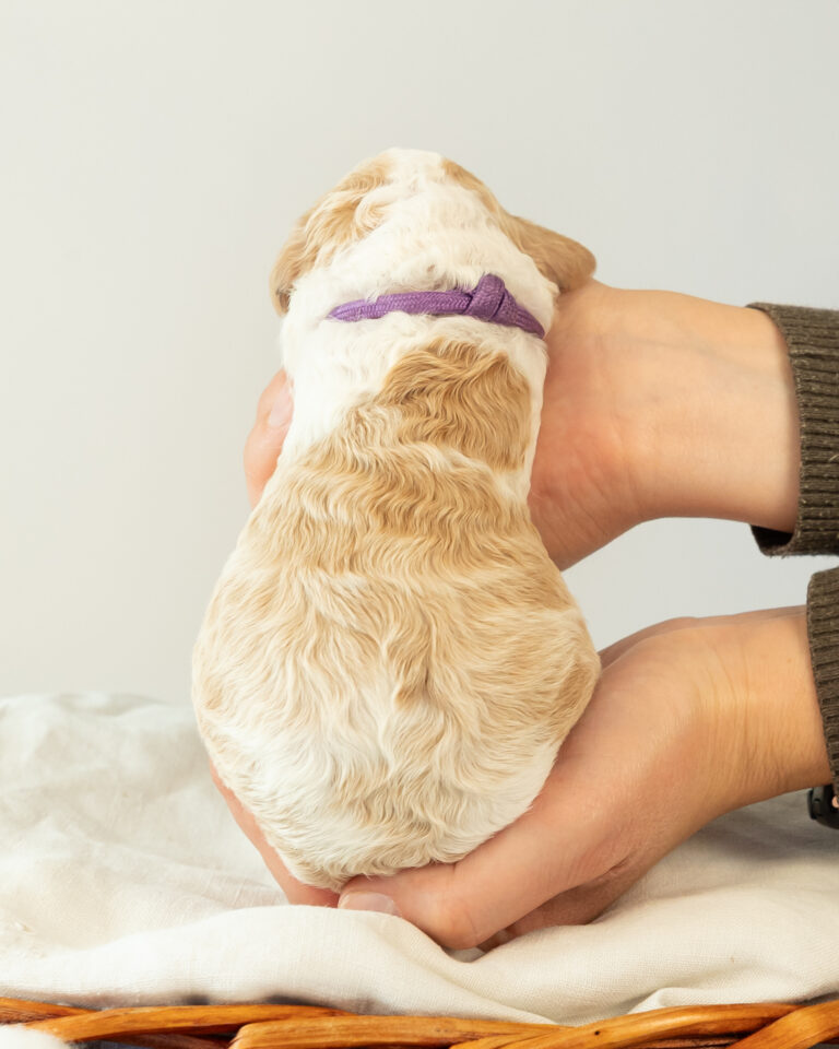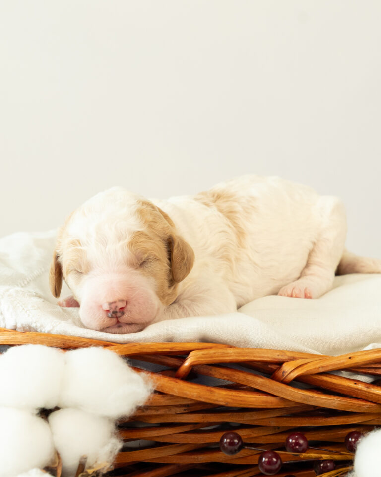 Valentine is a golden parti standard Goldendoodle puppy who will be ready for her forever home around December 9th. With such a sweet and gentle personality, she is the perfect pup to be your new forever friend.