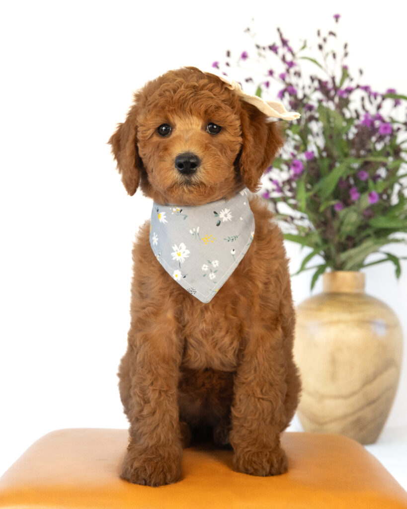 Cherry is a red Goldendoodle puppy who will be ready for her forever home around September 9th. Just like her mama, she is wonderfully social and enjoys belly rubs!