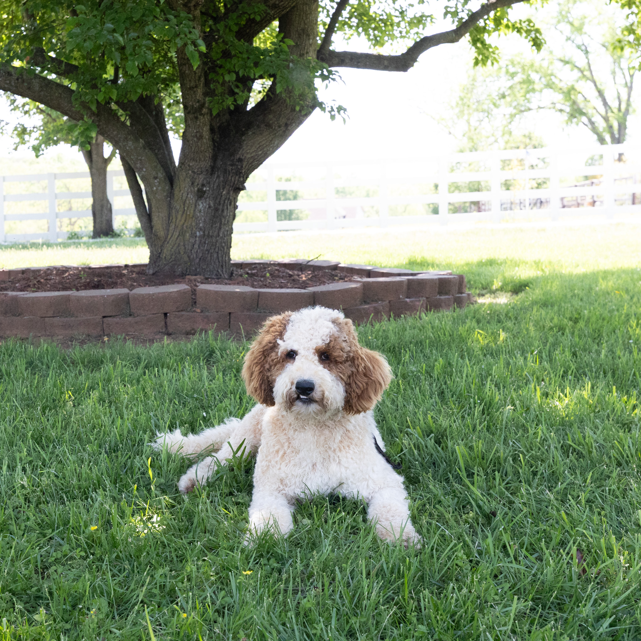 Sebastian is a handsome red parti Goldendoodle with a loving heart! This sweet boy is full of energy and endless affection for everyone! Quick to catch on to training, Sebastian is a smart guy who is eager to please his caretakers! He already sits well, takes treats gingerly and knows not to jump up when you don't want him to. Sebastian is very affectionate, and shows his love for you by leaning against you for scratches and hugs. Also very playful, he loves to run and play chase with any penmates in his yard with him. He weighs about 50lbs.