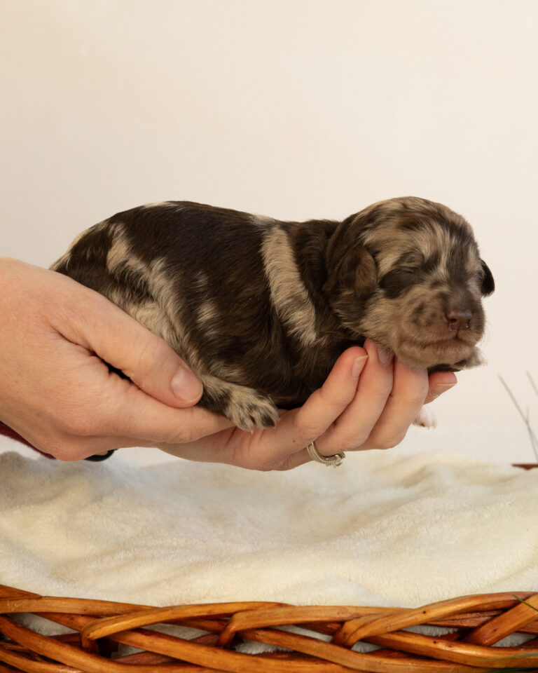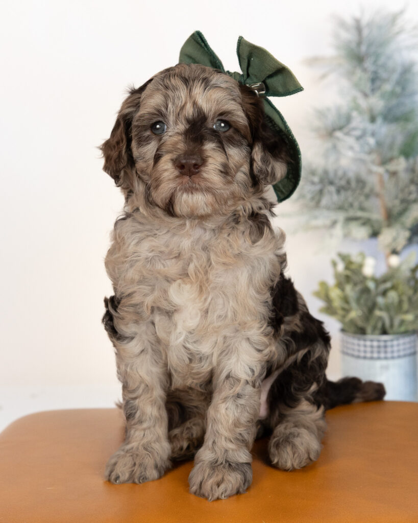 Thornton is our beautiful medium "wolf sable" merle goldendoodle stud! He weighs around 40lbs, but thinks he's smaller! He loves nothing more than snuggles and belly rubs!